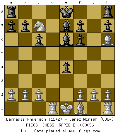 Last move : 1-0 2011 June 4 5:10:18 [Event "FICGS__CHESS__RAPID_E__000056"] [Site "FICGS"] [Date "2011.05.31"] [Round "1"] [White "Barradas,Anderson"] [Black "Jerez,Miriam"] [Result "1-0"] [WhiteElo "1242"] [BlackElo "0864"] 1.e4 e5 2.Nf3 Nc6 3.d4 d5 4.Nxe5 dxe4 5.Nc3 Nf6 6.Bg5 Nxe5 7.dxe5 Be7 8.exf6 gxf6 9.Bh6 Qxd1+ 10.Rxd1 Be6 11.Nb5 c6 12.Nc7+ 1-0 Scotch Opening Player White won this chess game. Follow this game move after move (download)Chess is above all, a fight ! (Emanuel Lasker) Wenn Spassky eine Figur opfert kannst du genauso gut aufgeben. Aber wenn Tal eine Figur opfert, spiel weiter. Er könnte noch eine weitere opfern, und dann ... wer weiß? (Miguel Najdorf) Todavía soy una víctima del Ajedrez. Tiene toda la belleza del arte y mucho mas. No puede ser comercializado. El Ajedrez es mas puro que el arte en su posición social. (Marcel Duchamp) Les Cavaliers se révèlent fort utiles dans les positions fermées. D'habitude, les Fous sont un peu plus forts que les Cavaliers dans les positions ouvertes. Qu'on le veuille ou non, il restera toujours des exceptions ! Heh, heh, heh. Time to abandon ship. (General Grievous in Star Wars ep.3)