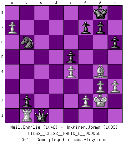 Last move : 0-1 2011 August 24 13:21:45 [Event "FICGS__CHESS__RAPID_E__000056"] [Site "FICGS"] [Date "2011.05.31"] [Round "1"] [White "Neil,Charlie"] [Black "Hakkinen,Jorma"] [Result "0-1"] [WhiteElo "1046"] [BlackElo "1093"] 1.c4 c6 2.e4 e5 3.Nc3 Nf6 4.d3 Bb4 5.Nge2 d6 6.g3 O-O 7.Bg2 Bxc3+ 8.bxc3 Bg4 9.h3 Bxe2 10.Qxe2 Nbd7 11.O-O a6 12.Bg5 b5 13.cxb5 axb5 14.Rfb1 Ra3 15.Bc1 Rxc3 16.Bd2 Ra3 17.Bb4 Ra8 18.Bxd6 Re8 19.Rc1 Qb6 20.Bc5 Qa5 21.Be3 b4 22.Rxc6 b3 23.a3 Rec8 24.Rxc8+ Rxc8 25.Bf1 Rc2 26.Qd1 Qc3 27.a4 b2 28.Rb1 h6 29.Be2 Nc5 30.Bxc5 Qxc5 31.a5 Rc1 32.d4 Rxd1+ 33.Bxd1 Qxd4 34.a6 Nd7 35.Bg4 Nb6 36.a7 Qc3 37.Kg2 Qc1 0-1 English : Caro-Kann defensive system Kingside Castling by player Black (move 6) Kingside Castling by player White (move 11) Player Black won this chess game. Follow this game move after move (download)There are two types of sacrifices: correct ones and mine. (Mikhail Tal) Im Reiche der Wirklichkeit ist man nie so glücklich wie im Reiche der Gedanken. (Arthur Schopenhauer) Siempre es mucho mejor sacrificar las piezas de tu oponente. (Savielly Tartakover) La vérité est comme le meilleur coup aux échecs : elle existe, mais il faut la chercher. (Arturo Perez-Reverte) Creativity is allowing yourself to make mistakes. Art is knowing which ones to keep. (Scott Adams)