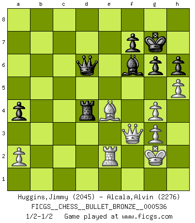 Last move : 1/2-1/2 2011 May 31 17:56:54 [Event "FICGS__CHESS__BULLET_BRONZE__000536"] [Site "FICGS"] [Date "2011.05.31"] [Round "1"] [White "Huggins,Jimmy"] [Black "Alcala,Alvin"] [Result "1/2-1/2"] [WhiteElo "2045"] [BlackElo "2276"] 1.e4 c5 2.Nf3 d6 3.d4 cxd4 4.Nxd4 Nf6 5.Nc3 a6 6.Bc4 e6 7.Bg5 Be7 8.O-O Qc7 9.Qe2 b5 10.Bb3 O-O 11.Kh1 b4 12.Nd1 h6 13.Bd2 Nc6 14.Nxc6 Qxc6 15.f3 a5 16.Bc4 Qc7 17.Ne3 Rd8 18.Rac1 d5 19.exd5 exd5 20.Bb5 Bc5 21.Ng4 Bxg4 22.fxg4 Qb6 23.Bd3 Ra7 24.Qf3 Ne4 25.Be1 Re7 26.c3 bxc3 27.bxc3 Ng5 28.Qd1 Qc7 29.Bh4 Be3 30.Rc2 Bf4 31.Re1 Bd6 32.Rxe7 Bxe7 33.Bxg5 Bxg5 34.Qf3 g6 35.g3 Rd6 36.c4 dxc4 37.Bxc4 Bf6 38.Kg2 Kg7 39.h4 a4 40.h5 Rd4 41.Bd3 Qd7 42.Be4 Qe7 43.Re2 Qd6 1/2-1/2 Sicilian : Najdorf, Lipnitzky attack Kingside Castling by player White (move 8) Kingside Castling by player Black (move 10) This chess game ended in a draw. Follow this game move after move (download)The chessboard is the world, the pieces are the phenomena of the Universe, the rules of the game are what we call the laws of Nature and the player on the other side is hidden from us. (Thomas Huxley) Es ist wirklich schade, dass so viele Schachspieler nicht auf ihr Äußeres achten! (Alexandra Kosteniuk) El Ajedrez es un regaderazo frío para la mente. (Sir John Simon) Il vaut mieux sacrifier les pièces de l'adversaire. (Xavier Tartacover) Think like a man of action, act like a man of thought. (Henri Louis Bergson)