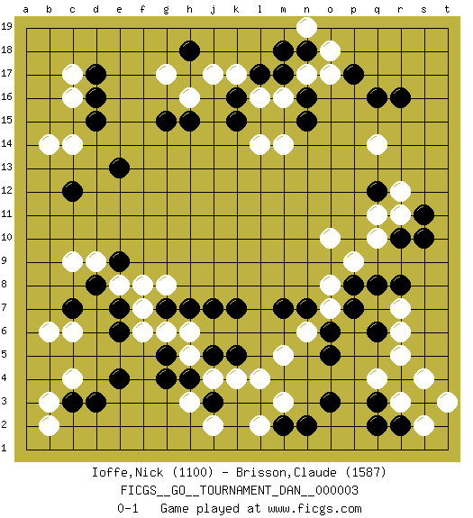 Last move : 0-1 2007 January 17 20:2:21 [Event "FICGS__GO__TOURNAMENT_DAN__000003"] [Site "FICGS"] [Date "2006.12.24"] [Round "1"] [Black "Ioffe,Nick"] [White "Brisson,Claude"] [Result "0-1"] [Rating 1 "1100"] [Rating 2 "1587"] 1.q16 q4 2.d16 c4 3.k16 c14 4.c12 c17 5.d17 c16 6.d15 b14 7.e13 q10 8.e4 c6 9.c3 b3 10.d3 b2 11.j3 m3 12.e7 c9 13.q12 o10 14.o5 r5 15.o3 m5 16.n7 n6 17.o6 o7 18.m7 k4 19.k7 j4 20.h4 h5 21.g5 h3 22.g4 j2 23.q2 r3 24.r2 s2 25.p7 o8 26.p8 p9 27.q6 r7 28.r8 r6 29.q8 q14 30.r10 r11 31.s10 q11 32.s11 r12 33.r16 k17 34.l17 l16 35.m17 j17 36.k15 m16 37.n16 l14 38.n15 m14 39.h15 h16 40.g15 g17 41.h18 n17 42.n18 o17 43.p17 o18 44.m18 n19 45.j5 h6 46.k5 l4 47.s3 s4 48.q3 t3 49.m2 l2 50.n2 g8 51.h7 g6 52.g7 f6 53.e6 f7 54.j7 e8 55.c7 b6 56.d8 d9 57.e9 f8 0-1 Here are the names of the openings (joseki) played in the four corners : Corner d16 : d16 c14 Hoshi (Hwajeom, Seongjeom, Xingwei`) 4-4 Point. The star or hoshi (4-4) point, emphasizing influence at the potential expense of territory. Ikken Kakari (Hankan Keolch'im, Yi Gua`jiao~, 1-Space Low Approach). White 2 is the standard approach move to the 4-4. Corner d4 : c4 e4 Komoku (Somok, Xiao~mu`) 3-4 Point. The komoku (3-4) point is the traditional corner enclosure move.. Ikken Takagakari (Hankan Nop'dakeolch'im, Yi Gaogua`jiao~, 1-Space High Approach). The 5-4 approach move has become more popular in modern times, as modern Go emphasizes speed and influence. Player White won this Go (weiqi, baduk) game. Follow this game move after move (download)Sacrifice for shape. (Anonymous) A good aphorism is too hard for the tooth of time, and is not worn away with the centuries, although it serves as food for every speech. (Friedrich Nietzsche)
