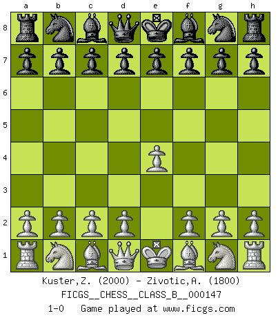 Last move : 1-0 2011 July 12 20:23:53 [Event "FICGS__CHESS__CLASS_B__000147"] [Site "FICGS"] [Date "2011.06.01"] [Round "1"] [White "Kuster,Zeljko"] [Black "Zivotic,Aleksandar"] [Result "1-0"] [WhiteElo "2000"] [BlackElo "1800"] 1.e4 1-0 This chess game has been lost on time (started : 2011.06.01 15:43:53) King's pawn Opening Player White won this chess game. Follow this game move after move (download)The passed pawn is a criminal, who should be kept under lock and key. Mild measures, such as police surveillance, are not sufficient. (Nimzovitch) Ich habe kein Problem mit Frauen, sondern nur mit dem Niveau ihres Schachspiels (Judith Polgar) Fischer deseaba darle a los Rusos una sopa de su propia medicina. (Larry Evans) Mon pion favori sur ma case favorite ! Bronstein en parlant d'un coup de pion en h5 quand il avait les Noirs. Internet: Absolute communication, absolute isolation. (Paul Carvel)