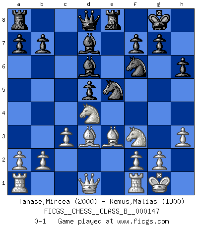 Last move : 0-1 2011 September 2 10:15:51 [Event "FICGS__CHESS__CLASS_B__000147"] [Site "FICGS"] [Date "2011.06.01"] [Round "1"] [White "Tanase,Mircea"] [Black "Remus,Matias"] [Result "0-1"] [WhiteElo "2000"] [BlackElo "1800"] 1.e4 e6 2.d4 d5 3.Nd2 h6 4.Bd3 c5 5.dxc5 Bxc5 6.exd5 exd5 7.Nb3 Bd6 8.Nf3 Nf6 9.Be3 O-O 10.O-O Nc6 11.c3 Re8 12.h3 Bd7 13.Nbd4 Ne5 0-1 French : Tarrasch Kingside Castling by player Black (move 9) Kingside Castling by player White (move 10) Player Black won this chess game. Follow this game move after move (download)Chess, like love, like music, has the power to make people happy. (Siegbert Tarrasch) Als ich elf wurde, wurde ich einfach gut. (Robert James Fischer) Ciertamente el estado mental actual de Bobby Fischer es una tragedia. Uno de los mas grandes jugadores de Ajedrez del mundo -el orgullo y pena del Ajedrez Americano. (Frank Brady) Les échecs, c'est la lutte contre l'erreur. (Johannes Zukertort) Horse racing is animated roulette. (Roger Kahn)
