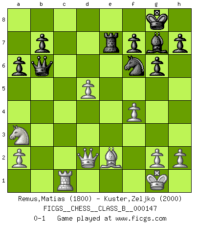 Last move : 0-1 2011 September 23 10:49:25 [Event "FICGS__CHESS__CLASS_B__000147"] [Site "FICGS"] [Date "2011.06.01"] [Round "1"] [White "Remus,Matias"] [Black "Kuster,Zeljko"] [Result "0-1"] [WhiteElo "1800"] [BlackElo "2000"] 1.e4 Nf6 2.e5 Nd5 3.d4 d6 4.c4 Nb6 5.exd6 cxd6 6.Nc3 g6 7.Be3 Bg7 8.Rc1 O-O 9.b3 Nc6 10.d5 Ne5 11.Be2 Re8 12.f4 Ned7 13.Nf3 Nf6 14.O-O e6 15.dxe6 Bxe6 16.Nd4 Bxc4 17.bxc4 Rxe3 18.Qd2 Re7 19.Rfd1 Rc8 20.Ndb5 a6 21.Na3 d5 22.Nxd5 Nbxd5 23.cxd5 Rxc1 24.Rxc1 Qb6+ 0-1 Alekhine's defense : Exchange variation Kingside Castling by player Black (move 8) Kingside Castling by player White (move 14) Player Black won this chess game. Follow this game move after move (download)Why must I lose to this idiot ? (Aron Nimzovich) Der Freibauer hat für mich eine Seele, genau wie der Mensch, Wünsche, die unerkannt in ihm schlummern, und Befürchtungen, von deren Existenz er selbst kaum ahnt. (Aaron Nimzowitsch) Los Peones son el alma de una partida de Ajedrez. (Francois Andre Danican Philidor) Je ne crois pas en la psychologie, je crois aux bons coups. (Robert Fischer) Man is reluctant to give credit for intelligence to anyone, except his enemies. (Albert Einstein)