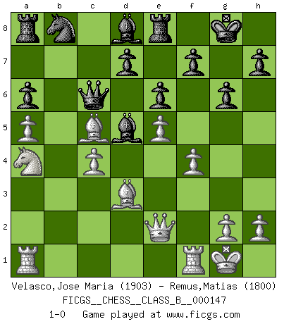 Last move : 1-0 2011 June 19 20:43:51 [Event "FICGS__CHESS__CLASS_B__000147"] [Site "FICGS"] [Date "2011.06.01"] [Round "1"] [White "Velasco,Jose Maria"] [Black "Remus,Matias"] [Result "1-0"] [WhiteElo "1903"] [BlackElo "1800"] 1.e4 e6 2.Nf3 c5 3.d4 cxd4 4.Nxd4 a6 5.Nc3 Qc7 6.Bd3 Nf6 7.O-O Bc5 8.Nb3 Be7 9.Be3 b5 10.f4 Bb7 11.e5 Nd5 12.Nxd5 Bxd5 13.a4 b4 14.a5 Qb7 15.Qe2 g6 16.Nc5 Qc6 17.Na4 Bd8 18.c3 bxc3 19.bxc3 O-O 20.Bc5 Re8 21.c4 1-0 French defense Kingside Castling by player White (move 7) Kingside Castling by player Black (move 19) Player White won this chess game. Follow this game move after move (download)You have to have the fighting spirit. You have to force moves and take chances. (Bobby Fischer) Intelligenz läßt sich nicht am Weg, sondern nur am Ergebnis feststellen. (Garry Kasparov) El tablero es el mundo, las piezas es el fenomeno del universo, las reglas del juego son lo que llamamos leyes de la naturaleza y el jugador del lado opuesto, se encuentra oculto a nuestra vista. (Thomas Huxley) Si rien de grave n'est détecté lors de l'analyse d'une position, on joue alors le coup. Seconde règle de Blumenfeld. It's not a bug - it's an undocumented feature. (Anonymous)