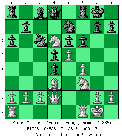 Last move : 1-0 2011 August 27 22:1:45 [Event "FICGS__CHESS__CLASS_B__000147"] [Site "FICGS"] [Date "2011.06.01"] [Round "1"] [White "Remus,Matias"] [Black "Hasyn,Thomas"] [Result "1-0"] [WhiteElo "1800"] [BlackElo "1836"] 1.e4 e6 2.d4 d5 3.Nc3 Bb4 4.e5 c5 5.Bd2 Ne7 6.Nb5 Bxd2+ 7.Qxd2 O-O 8.f4 a6 9.Nd6 cxd4 10.Nf3 Nbc6 11.Bd3 f6 12.O-O 1-0 French : Winawer, Advance, Bogolyubov variation Kingside Castling by player Black (move 7) Kingside Castling by player White (move 12) Player White won this chess game. Follow this game move after move (download)No Chess Grandmaster is normal; they only differ in the extent of their madness. (Viktor Korchnoi) Mein erstes Ziel war nicht, die Partie zu gewinnen, sondern eine Figur zu opfern. -- der junge (Wilhelm Steinitz) Observen a Garry Kasparov. Después de una derrota, invariablemente el gana la próxima partida. Prácticamente hace pedazos a su siguiente oponente. Eso es algo que tenemos que aprender a lograr. (Maurice Ashley) On croit qu'il y a plus de mauvais joueurs que de bons joueurs, c'est faux : Il y a autant de joueurs qui gagnent que de joueurs qui perdent. (Philippe Geluck) Secret operations are essential in war; upon them the army relies to make its every move. (Sun Tzu)