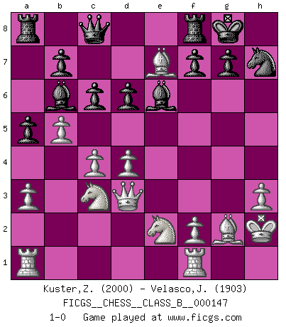 Last move : 1-0 2011 June 13 10:7:59 [Event "FICGS__CHESS__CLASS_B__000147"] [Site "FICGS"] [Date "2011.06.01"] [Round "1"] [White "Kuster,Zeljko"] [Black "Velasco,Jose Maria"] [Result "1-0"] [WhiteElo "2000"] [BlackElo "1903"] 1.c4 e5 2.g3 Nc6 3.Bg2 Nf6 4.Nc3 Bc5 5.a3 d6 6.e3 O-O 7.Nge2 Bb6 8.O-O Bg4 9.h3 Bd7 10.b4 a5 11.b5 Ne7 12.d4 Qc8 13.Kh2 Be6 14.Qd3 exd4 15.exd4 h6 16.g4 c6 17.g5 hxg5 18.Bxg5 Nh7 19.Bxe7 1-0 English Opening Kingside Castling by player Black (move 6) Kingside Castling by player White (move 8) Player White won this chess game. Follow this game move after move (download)All my games are real. (Bobby Fischer) Ich spiele ehrlich und spiele, um zu gewinnen. Wenn ich verliere nehme ich meine Medizin. (Robert James Fischer) Con o sin el título, Bobby Fischer fue sin lugar a dudas el mas grande jugador de su época. (Burt Hochberg) Nous sommes les pions de la mystérieuse partie d'Echecs jouée par Dieu. Il nous déplace, nous arrête, nous pousse encore, puis nous lance un à un dans la boîte du Néant. Epitaphe sur la tombe de David Janowsky (1868-1927). The real danger is not that computers will begin to think like men, but that men will begin to think like computers. (Sydney J. Harris)