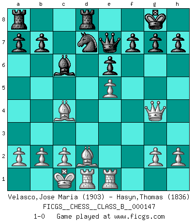 Last move : 1-0 2011 August 20 21:53:8 [Event "FICGS__CHESS__CLASS_B__000147"] [Site "FICGS"] [Date "2011.06.01"] [Round "1"] [White "Velasco,Jose Maria"] [Black "Hasyn,Thomas"] [Result "1-0"] [WhiteElo "1903"] [BlackElo "1836"] 1.e4 c5 2.Nf3 d6 3.d4 cxd4 4.Nxd4 Nf6 5.Nc3 Nc6 6.Bg5 e6 7.Qd2 Be7 8.O-O-O O-O 9.f4 Nxd4 10.Qxd4 Qa5 11.Bc4 Bd7 12.e5 dxe5 13.fxe5 Bc6 14.Bd2 Nd7 15.Nd5 Qd8 16.Nxe7+ Qxe7 17.Rhe1 Rfd8 18.Qg4 1-0 This chess game has been lost on time (started : 2011.06.01 15:43:53) Sicilian : Richter-Rauzer, Rauzer attack, 7...Be7 Queenside Castling by player White (move 8) Kingside Castling by player Black (move 8) Player White won this chess game. Follow this game move after move (download)The tactician must know what to do whenever something needs doing; the strategist must know what to do when nothing needs doing. (Savielly Tartakover) Dein Körper muss in Topform sein. Dein Schach verfällt, wenn dein Körper verfällt. Der Körper kann nicht vom Geist getrennt werden. (Robert James Fischer) Un juego de Ajedrez es un dialogo, una conversación entre un jugador y su oponente. Cada movimiento del oponente puede contener amenazas o tropiezos, pero un jugador no se puede defender de las amenazas o tomar ventaja de los tropiezos si es que no se pregunta a sí mismo: ¿Que es lo que mi oponente va a hacer después de cada movida?. (Bruce A. Moon) Je ne suis pas le dernier à jouer lâchement des coups douteux pendant le zeïtnot de l'adversaire pour l'achever: en effet les coups qui font le plus peur sont ceux que l'on ne comprend pas. Je me fais souvent peur quand je joue. (Un professeur anonyme) The difference between stupidity and genius is that genius has its limits. (Murphy)