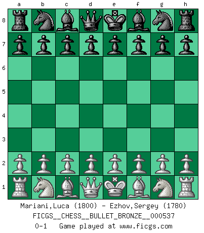 Last move : 0-1 2011 June 1 19:8:17 [Event "FICGS__CHESS__BULLET_BRONZE__000537"] [Site "FICGS"] [Date "2011.06.01"] [Round "1"] [White "Mariani,Luca"] [Black "Ezhov,Sergey"] [Result "0-1"] [WhiteElo "1800"] [BlackElo "1780"] 0-1 This chess game has been lost on time (started : 2011.06.01 17:0:39) Player Black won this chess game. Follow this game move after move (download)White lost because he failed to remember the right continuation and had to think up the moves himself. (Siegbert Tarrasch) Es genügt nicht ein guter Spieler zu sein, man muß auch gut spielen. (Siegbert Tarrasch) El Ajedrez es un invernadero donde los frutos del carácter pueden madurar mas completamente que en la vida. (Edward Morgan Foster) Aux échecs, l'amour-propre est satisfait quand on remporte la victoire, mais il n'y a pas de honte à être battu. (Benjamin Franklin) Animated gif is worth one mega-word. (Unknown)