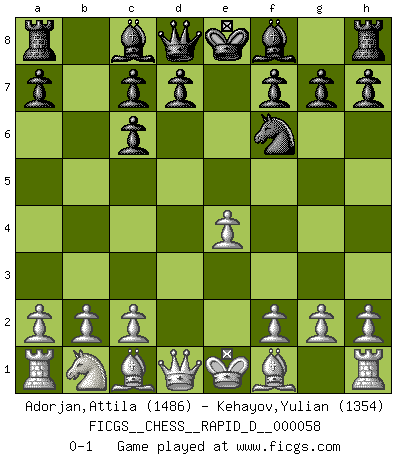 Last move : 0-1 2011 September 22 22:43:22 [Event "FICGS__CHESS__RAPID_D__000058"] [Site "FICGS"] [Date "2011.06.02"] [Round "1"] [White "Adorjan,Attila"] [Black "Kehayov,Yulian"] [Result "0-1"] [WhiteElo "1486"] [BlackElo "1354"] 1.e4 e5 2.Nf3 Nc6 3.d4 exd4 4.Nxd4 Nf6 5.Nxc6 bxc6 0-1 This chess game has been lost on time (started : 2011.06.02 9:55:38) Scotch : Schmidt variation Player Black won this chess game. Follow this game move after move (download)All that matters on the Chessboard is good moves. (Bobby Fischer) Wer nie einen Fehler gemacht hat, hat nie etwas Neues ausprobiert. (Albert Einstein) El Ajedrez es un juego de pelea el cual es puramente intelectual e incluye la suerte. (Richard Reti) C'est une question de caractère, Beaucoup de gens perdent leur motivation très vite. D'autres, ils sont rares, peuvent la conserver très longtemps. J'aime les échecs, encore aujourd'hui je suis heureux d'analyser des parties. J'aime toujours gagner, je déteste encore perdre. Bien jouer est important pour mon intégrité intellectuelle et morale. Et puis les échecs vivent en ce moment une période historique grâce à Internet. Ils se développent dans les systèmes éducatifs à travers le monde. Ils sortent de leur ghetto, et c'est mon rôle de mener à bien cette révolution. (Gary Kasparov) How many people work in NATO Headquarters ? - About half of them. (Dirk Stikker, NATO general secretary)