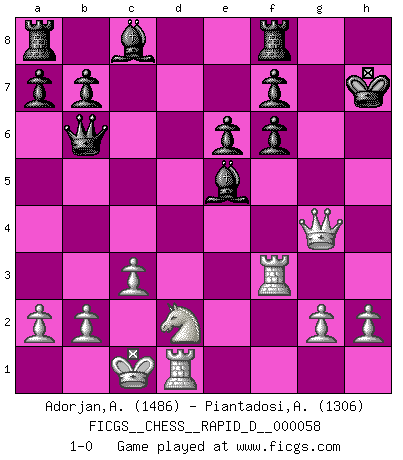 Last move : 1-0 2011 August 7 23:7:31 [Event "FICGS__CHESS__RAPID_D__000058"] [Site "FICGS"] [Date "2011.06.02"] [Round "1"] [White "Adorjan,Attila"] [Black "Piantadosi,Angelo"] [Result "1-0"] [WhiteElo "1486"] [BlackElo "1306"] 1.e4 e6 2.d4 d5 3.Nd2 dxe4 4.Nxe4 Nd7 5.Nf3 Ngf6 6.Nxf6+ Nxf6 7.Bd3 Be7 8.Qe2 O-O 9.Bg5 c5 10.dxc5 Bxc5 11.O-O-O Qb6 12.Bxf6 gxf6 13.Nd2 Bxf2 14.Rhf1 Bd4 15.c3 Be5 16.Bxh7+ Kxh7 17.Qh5+ Kg7 18.Qg4+ Kh7 19.Rf3 1-0 French : Tarrasch Kingside Castling by player Black (move 8) Queenside Castling by player White (move 11) Player White won this chess game. Follow this game move after move (download)War is the child of passion, passion is the child of narcissism and narcissism is the child. (...) Another game ? (Thibault de Vassal) Die Elozahlen sind sehr schlecht für das Schach. Jetzt ist Schach eine Sportindustrie, die darauf zielt Elopunkte zu machen. (Miguel Najdorf) El estómago es una parte esencial del maestro de Ajedrez. (Bent Larsen) Les échecs sont utiles à l'exercice de la faculté de penser et à celle de l'imagination. Car nous devons posséder une méthode élaborée pour atteindre des buts partout où nous devons conduire notre raison. (Leibnitz) Hold em is to stud what chess is to checkers. (Johnny Moss)