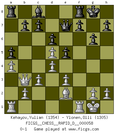 Last move : 0-1 2011 October 12 23:46:44 [Event "FICGS__CHESS__RAPID_D__000058"] [Site "FICGS"] [Date "2011.06.02"] [Round "1"] [White "Kehayov,Yulian"] [Black "Ylonen,Olli"] [Result "0-1"] [WhiteElo "1354"] [BlackElo "1305"] 1.e4 e5 2.Nc3 Nf6 3.Nf3 Nc6 4.Be2 Bb4 5.O-O O-O 6.Nd5 Bc5 7.d3 Nxd5 8.exd5 Nd4 9.Nxd4 Bxd4 10.c3 Bb6 11.a4 a5 12.Be3 Bxe3 13.fxe3 d6 14.Qb3 Qe7 15.d4 g6 0-1 This chess game has been lost on time (started : 2011.06.02 9:55:38) Vienna : Falkbeer variation Kingside Castling by player White (move 5) Kingside Castling by player Black (move 5) Player Black won this chess game. Follow this game move after move (download)At this time Fischer is simply a level above all the best Chessplayers in the world. (John Jacobs) Im Schach gibt es keinen Platz für Galanterie. (Irving Chernev) Una buena ofensiva y una buena defensa, comienzan ambas con un buen desarrollo. (Bruce A. Moon) Des idées, des idées, j'en ai cent, j'en ai mille. Des bonnes, des mauvaises, applicables, irréalisables... Il suffit de faire le tri ! (Roos) All men can see these tactics whereby I conquer, but what none can see is the strategy out of which victory is evolved. (Sun Tzu)