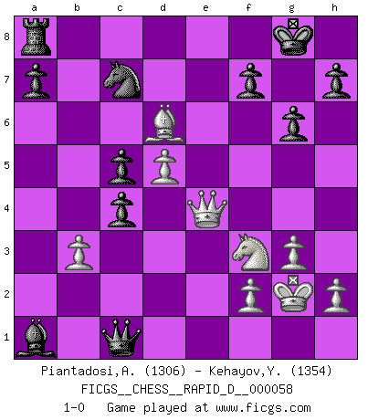 Last move : 1-0 2011 October 13 23:47:25 [Event "FICGS__CHESS__RAPID_D__000058"] [Site "FICGS"] [Date "2011.06.02"] [Round "1"] [White "Piantadosi,Angelo"] [Black "Kehayov,Yulian"] [Result "1-0"] [WhiteElo "1306"] [BlackElo "1354"] 1.d4 Nf6 2.c4 g6 3.Nc3 c5 4.d5 Bg7 5.Qc2 Na6 6.a3 d6 7.Nf3 O-O 8.e4 Qa5 9.Bd2 Qb6 10.Be2 e6 11.O-O exd5 12.exd5 Re8 13.Rfe1 Bf5 14.Bd3 Bxd3 15.Qxd3 Nc7 16.Na4 Qa6 17.Nc3 Qb6 18.Qc2 Qa6 19.Ne4 Nxe4 20.Rxe4 b5 21.b3 Bxa1 22.Bf4 Rxe4 23.Qxe4 Qxa3 24.g3 bxc4 25.Bxd6 Qc1+ 26.Kg2 1-0 This chess game has been lost on time (started : 2011.06.02 9:55:38) King's Indian defense, 3.Nc3 Kingside Castling by player Black (move 7) Kingside Castling by player White (move 11) Player White won this chess game. Follow this game move after move (download)It was clear to me that the vulnerable point of the American Grandmaster (Bobby Fischer) was in double-edged, hanging, irrational positions, where he often failed to find a win even in a won position. (Efim Geller) Es ist wirklich schade, dass so viele Schachspieler nicht auf ihr Äußeres achten! (Alexandra Kosteniuk) Ser exitoso en el Ajedrez te permite descubrir tu propia personalidad. Eso es lo que deseo para los niños de mi clase. (Saudin Robovic) Ce qui est bien, c'est d'avoir tout un tas de pièces en prise : l'adversaire ne peut en prendre qu'une à la fois. Cité par Thierry Audin. Treat your password like your toothbrush. Don't let anybody else use it, and get a new one every six months. (Clifford Stoll)