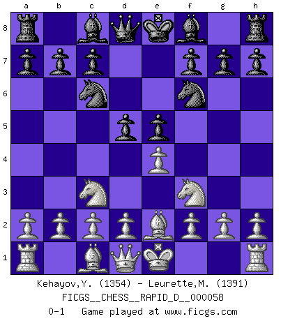 Last move : 0-1 2011 July 7 20:10:0 [Event "FICGS__CHESS__RAPID_D__000058"] [Site "FICGS"] [Date "2011.06.02"] [Round "1"] [White "Kehayov,Yulian"] [Black "Leurette,Marc-Antoine"] [Result "0-1"] [WhiteElo "1354"] [BlackElo "1391"] 1.e4 e5 2.Nc3 Nc6 3.Nf3 Nf6 4.Be2 d5 0-1 This chess game has been lost on time (started : 2011.06.02 9:55:38) Vienna game, Max Lange defense Player Black won this chess game. Follow this game move after move (download)That's what Chess is all about. One day you give your opponent a lesson, the next day he gives you one. (Bobby Fischer) Die Auseinandersetzung mit Karpow war politisch geprägt. Er stand für das kommunistische System, wurde von dessen Repräsentanten gehätschelt. Ich war der Oppositionelle. Jeder Schachweltmeister spiegelt auch die gesellschaftlichen Verhältnisse wider. Kramnik steht für die Börsen-Generation des Neuen Markts, ideologiefrei, zahlenfixiert. (Garry Kasparov) Es el objetivo de la escuela moderna no tratar cada posición de acuerdo a una regla general, sino de acuerdo al principio inherente en la posición. (Richard Reti) Un journaliste : 'Vous préférez avoir une dame de plus sur l'échiquier ou au lit ?' Boris Spassky : 'Ca dépend de la position.' He who laughs last probably does not get the joke. (Unknown)
