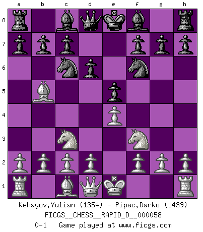 Last move : 0-1 2011 July 7 20:10:0 [Event "FICGS__CHESS__RAPID_D__000058"] [Site "FICGS"] [Date "2011.06.02"] [Round "1"] [White "Kehayov,Yulian"] [Black "Pipac,Darko"] [Result "0-1"] [WhiteElo "1354"] [BlackElo "1439"] 1.e4 e5 2.Nc3 Nf6 3.Nf3 Nc6 4.Bb5 d6 0-1 This chess game has been lost on time (started : 2011.06.02 9:55:38) Vienna : Falkbeer variation Player Black won this chess game. Follow this game move after move (download)By this measure (on the gap between Fischer & his contemporaries), I consider him the greatest world champion. (Garry Kasparov) Ich verstehe Aljechins Kombinationen ganz gut; aber woher er diese Angriffschancen bekommt und wie er die Eröffnung behandelt das ist für mich ein Buch mit sieben Siegeln. (Rudolf Spielmann) Observen a Garry Kasparov. Después de una derrota, invariablemente el gana la próxima partida. Prácticamente hace pedazos a su siguiente oponente. Eso es algo que tenemos que aprender a lograr. (Maurice Ashley) Les échecs sont un jeu par leur forme, un art par leur essence et une science par sa difficulté d'acquisition. Ils peuvent vous procurer autant de plaisir qu'un bon livre ou une belle musique, mais vous n'aurez une réelle joie que si vous arrivez à bien jouer. (Tigran Petrosian) Wisdom doesn't necessarily come with age. Sometimes age just shows up all by itself. (Tom Wilson)
