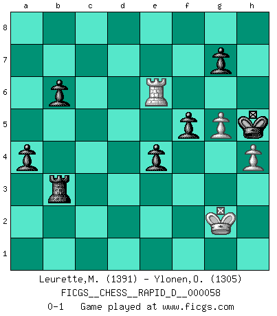 Last move : 0-1 2011 September 5 8:31:18 [Event "FICGS__CHESS__RAPID_D__000058"] [Site "FICGS"] [Date "2011.06.02"] [Round "1"] [White "Leurette,Marc-Antoine"] [Black "Ylonen,Olli"] [Result "0-1"] [WhiteElo "1391"] [BlackElo "1305"] 1.e4 c5 2.Nf3 d6 3.Bb5+ Bd7 4.Bxd7+ Qxd7 5.O-O Nc6 6.c3 Nf6 7.Re1 e6 8.d4 cxd4 9.cxd4 d5 10.exd5 Nxd5 11.Nc3 Be7 12.Nxd5 Qxd5 13.Be3 O-O 14.b3 Rac8 15.Rc1 Bb4 16.Re2 h6 17.Rec2 Ba3 18.Rb1 Qf5 19.Qe2 Nxd4 20.Bxd4 Rxc2 21.Qe5 Qxe5 22.Bxe5 Rxa2 23.Nd4 Rd8 24.f4 Bc5 25.Rd1 Bxd4+ 26.Bxd4 Ra3 27.Rd3 Rxd4 28.Rxd4 Rxb3 29.g4 a5 30.Rd8+ Kh7 31.Ra8 b6 32.Ra7 f5 33.g5 hxg5 34.fxg5 e5 35.Kg2 Kg6 36.h4 e4 37.Re7 a4 38.Re6+ Kh5 0-1 Sicilian : Canal-Sokolsky attack, 3...Bd7 Kingside Castling by player White (move 5) Kingside Castling by player Black (move 13) Player Black won this chess game. Follow this game move after move (download)The winner of the game is the player who makes the next-to-last mistake. (Savielly Tartakover) Mit Schach schule ich mein Gefühl für Geometrie, was für Tennis und Schach gleichermaßen wichtig ist. (Boris Becker) Un mal plan es mejor que no tener ningún plan. (Frank Marshall) Toutes choses étant égales, c'est la conviction qui gagne. Alliée à une volonté de vaincre, elle sert de détonateur, suscite des idées, disperse les doutes et aide à penser clairement. (Robert Fischer) The Internet is the world's largest library. It's just that all the books are on the floor. (John Allen Paulos)