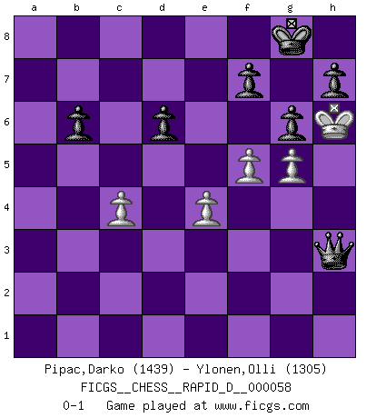 Last move : 0-1 2011 August 20 0:45:24 [Event "FICGS__CHESS__RAPID_D__000058"] [Site "FICGS"] [Date "2011.06.02"] [Round "1"] [White "Pipac,Darko"] [Black "Ylonen,Olli"] [Result "0-1"] [WhiteElo "1439"] [BlackElo "1305"] 1.e4 c5 2.Nf3 d6 3.Nc3 Nf6 4.Bb5+ Bd7 5.Bxd7+ Qxd7 6.d4 cxd4 7.Nxd4 g6 8.O-O Bg7 9.Nf3 Nc6 10.a3 O-O 11.Re1 Ng4 12.h3 Bxc3 13.bxc3 Nge5 14.Rb1 Nxf3+ 15.Qxf3 Ne5 16.Qe2 Rac8 17.Bf4 Rxc3 18.Bxe5 dxe5 19.Red1 Qc6 20.Rdc1 b6 21.a4 Qxa4 22.Ra1 Ra3 23.Rab1 Rd8 24.c4 Ra2 25.Rb2 Rxb2 26.Qxb2 Rd1+ 27.Rxd1 Qxd1+ 28.Kh2 Qd6 29.f3 a5 30.g4 Qb4 31.Qxe5 Qd6 32.Qxd6 exd6 33.Kg3 a4 34.Kf4 a3 35.Kg5 a2 36.Kh6 a1Q 37.f4 Qd4 38.f5 Qe3+ 39.g5 Qxh3+ 0-1 Sicilian Kingside Castling by player White (move 8) Kingside Castling by player Black (move 10) Promotion Queen by player Black (move 36) Player Black won this chess game. Follow this game move after move (download)I still hope to kill Fischer. (Boris Spassky) Es liegt in der Natur, vernüftig zu denken und unlogisch zu handeln. (Anatole France) En la vida, como en el Ajedrez, los Peones propios obstruyen nuestro camino. La gran fortuna de un hombre, su comodidad, placer, hijos, libros, que deberÃan ayudarle a ganar, con mucha frecuencia lo ponen en Jaque Mate. (Charles Buxton) Si rien de grave n'est détecté lors de l'analyse d'une position, on joue alors le coup. Seconde règle de Blumenfeld. Perfection is achieved, not when there is nothing more to add, but when there is nothing left to take away. (Antoine de Saint-Exupéry)