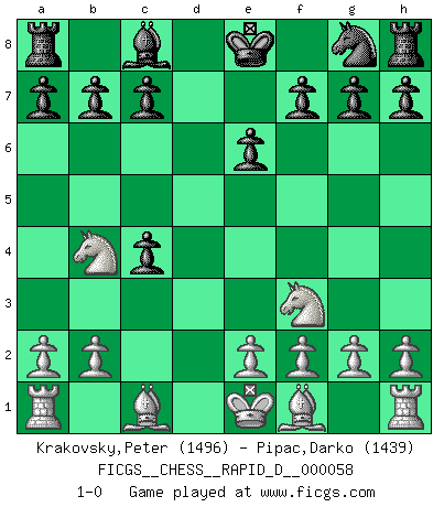 Last move : 1-0 2011 June 23 18:48:32 [Event "FICGS__CHESS__RAPID_D__000058"] [Site "FICGS"] [Date "2011.06.02"] [Round "1"] [White "Krakovsky,Peter"] [Black "Pipac,Darko"] [Result "1-0"] [WhiteElo "1496"] [BlackElo "1439"] 1.d4 d5 2.c4 dxc4 3.Nf3 Nc6 4.d5 Nb4 5.Qa4+ Qd7 6.Qxb4 Qxd5 7.Nc3 e6 8.Nxd5 Bxb4+ 9.Nxb4 1-0 QGA : 3.Nf3 Player White won this chess game. Follow this game move after move (download)The stomach is an essential part of the Chess master. (Bent Larsen) Der 70jährige Viktor Kortschnoi: Die Rentenanstalt wollte mich zwingen in Rente zu gehen. Meine Frau erhält jetzt eine Pension- und ich zahle weiter in die Rentenkasse ein! (Viktor Kortschnoi) Ayuda a tus piezas para que ellas te puedan ayudar. (Paul Morphy) Il n'y a pas eu de défaite parce que je ne crois pas que cet ordinateur ait jamais existé. IBM a triché en refusant d'imprimer les modes de recherche de la machine. C'est évident, pendant le match, des coups décisifs ont été joués par des êtres humains. Aujourd'hui, les meilleurs spécialistes en informatique ne peuvent toujours pas expliquer comment Deep-Blue a pu jouer contre la logique des ordinateurs. IBM a gagné une guerre de communication, mais ils sont incapables de prouver que l'ordinateur a gagné tout seul. (Garry Kasparov) The Movers & Shakers of this world are those who play chess in the mornings and go to the disco in the evenings. (Dinesh De Silva)