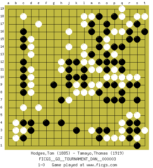 Last move : 1-0 2007 March 8 11:14:34 [Event "FICGS__GO__TOURNAMENT_DAN__000003"] [Site "FICGS"] [Date "2006.12.24"] [Round "1"] [Black "Hodges,Tom"] [White "Tamayo,Thomas"] [Result "1-0"] [Rating 1 "1885"] [Rating 2 "1919"] 1.r16 e17 2.d4 q3 3.c16 p16 4.m16 d15 5.c15 d14 6.c14 j16 7.q14 r5 8.k3 c6 9.c8 e6 10.f4 d9 11.c9 d10 12.c10 d11 13.c11 d8 14.n14 r17 15.s17 s16 16.s15 q16 17.r15 s18 18.t16 q18 19.r9 c3 20.c4 m3 21.h4 b4 22.d3 b2 23.c2 b3 24.q7 p13 25.p14 p10 26.q12 r10 27.s9 q9 28.q8 p8 29.p7 o8 30.o7 s10 31.s7 l17 32.m17 m18 33.n18 l18 34.o17 t18 35.p18 q19 36.q11 q10 37.o11 o15 38.n15 o14 39.o13 p11 40.p12 n13 41.o12 l14 42.o16 l12 43.l10 m9 44.n8 n9 45.o9 o10 46.p9 n11 47.n12 m11 48.j10 h12 49.k12 k11 50.l11 m12 51.j12 h11 52.j11 j14 53.m13 l13 54.o3 o2 55.n2 p2 56.n3 k9 57.j9 j7 58.l9 k8 59.k10 l8 60.h7 m8 61.g9 d13 62.c12 c18 63.s4 s5 64.r4 q4 65.r2 q2 66.r3 s2 67.s1 t3 68.s3 1-0 Here are the names of the openings (joseki) played in the four corners : Corner d16 : e17 c16 Mokuhazushi (Waemok, Wai`mu`) 5-3 Point. The mokuhazushi (5-3) point was popular in the Edo period in Japan (1600 - 1867). It emphasizes influence; territorially, it is inferior to the 3-4 point. Komoku Kakari. Black 2 is the standard approach because of its solidity and stability. Corner q16 : r16 p16 Komoku (Somok, Xiao~mu`) 3-4 Point. The komoku (3-4) point is the traditional corner enclosure move.. Ikken Takagakari (Hankan Nop'dakeolch'im, Yi Gaogua`jiao~, 1-Space High Approach). The 5-4 approach move has become more popular in modern times, as modern Go emphasizes speed and influence. Corner d4 : d4 c6 Hoshi (Hwajeom, Seongjeom, Xingwei`) 4-4 Point. The star or hoshi (4-4) point, emphasizing influence at the potential expense of territory. Ikken Kakari (Hankan Keolch'im, Yi Gua`jiao~, 1-Space Low Approach). White 2 is the standard approach move to the 4-4. Player Black won this Go (weiqi, baduk) game. Follow this game move after move (download)If you lose by one point, take a rest. (Anonymous) He who fights with monsters should be careful lest he thereby become a monster. (Friedrich Nietzsche, Beyond Good and Evil)