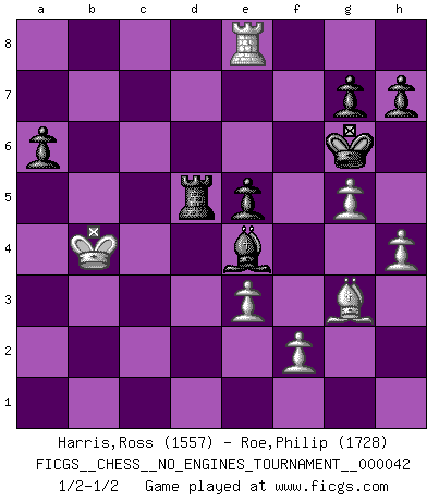 Last move : 1/2-1/2 2011 July 13 9:31:36 [Event "FICGS__CHESS__NO_ENGINES_TOURNAMENT__000042"] [Site "FICGS"] [Date "2011.06.04"] [Round "1"] [White "Harris,Ross"] [Black "Roe,Philip"] [Result "1/2-1/2"] [WhiteElo "1557"] [BlackElo "1728"] 1.d4 Nf6 2.Nf3 e6 3.Bf4 b6 4.e3 Bb7 5.Nbd2 c5 6.h3 Nc6 7.c3 d5 8.Bb5 a6 9.Bxc6+ Bxc6 10.Ne5 Bb7 11.Qf3 Bd6 12.g4 Qc7 13.g5 Ne4 14.Qh5 Nxd2 15.Kxd2 cxd4 16.Nxf7 dxc3+ 17.bxc3 Qxf7 18.Qxf7+ Kxf7 19.Bxd6 d4 20.Rhc1 dxc3+ 21.Rxc3 Rhd8 22.Rd3 Kg6 23.h4 Rac8 24.Bg3 Kf5 25.Rxd8 Rxd8+ 26.Kc3 Be4 27.a4 Rd3+ 28.Kb4 Bd5 29.Rb1 e5 30.a5 bxa5+ 31.Kxa5 Ra3+ 32.Kb4 Ra2 33.Kc5 Be4 34.Rb8 Ra5+ 35.Kb4 Rd5 36.Rf8+ Kg6 37.Re8 1/2-1/2 Queen's pawn game This chess game ended in a draw. Follow this game move after move (download)I know people who have all the will in the world, but still can't play good Chess. (Bobby Fischer) Ich habe die besten Aussichten, den ersten Preis zu gewinnen - denn jeder muss gegen Steinitz spielen, nur ich nicht! (Wilhelm Steinitz) Yo creo que el Ajedrez posee una magia que es también una ayuda en la edad avanzada. Una rodilla reumática es olvidada durante una partida de Ajedrez y otros eventos pueden parecer algo sin importancia comparada a una catástrofe en el tablero de Ajedrez. (Vlastimil Hort) Vous savez, camarade Pachman, je n'éprouve pas de plaisir à être ministre, je jouerais plutôt aux échecs comme vous, ou alors ferais une révolution au Venezuela. (Che Guevara à Ludek Pachman, 'Checkmate in Prague', 1975) Perseverance does not equal worthiness. Next time you want to get my attention, wear something fun. Low-riding jeans are hot. (Gregory House, House M.D.)