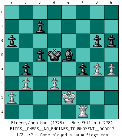 Last move : 1/2-1/2 2011 December 17 10:8:47 [Event "FICGS__CHESS__NO_ENGINES_TOURNAMENT__000042"] [Site "FICGS"] [Date "2011.06.04"] [Round "1"] [White "Pierre,Jonathan"] [Black "Roe,Philip"] [Result "1/2-1/2"] [WhiteElo "1775"] [BlackElo "1728"] 1.e4 e5 2.Nf3 Nc6 3.Bb5 a6 4.Bxc6 dxc6 5.d4 exd4 6.Qxd4 Qxd4 7.Nxd4 Bd7 8.Nc3 O-O-O 9.Bd2 Ne7 10.O-O-O Ng6 11.Nde2 Bd6 12.f4 f6 13.h3 Rhe8 14.Rhf1 c5 15.Ng3 b5 16.Rde1 Bc6 17.Nf5 Bf8 18.Ng3 b4 19.Nd1 Rd4 20.Nf2 Bd6 21.Nf5 Rxd2 22.Kxd2 Bxf4+ 23.Ke2 Bb5+ 24.Nd3 Rxe4+ 25.Kf3 Rxe1 26.Rxe1 Bxd3 27.cxd3 Ne5+ 28.Ke2 g6 29.Ne3 Nc6 30.Nc2 Be5 31.b3 f5 32.Kf3 Kd7 33.g4 Bc3 34.Rg1 Ne5+ 35.Ke2 f4 36.Ne1 Ke6 37.Nf3 Kd5 38.Nxe5 Bxe5 39.h4 h6 40.Rc1 Bc3 41.Rf1 Be5 42.Rc1 Bc3 43.Rf1 Be5 1/2-1/2 Ruy Lopez : Exchange variation Queenside Castling by player Black (move 8) Queenside Castling by player White (move 10) This chess game ended in a draw. Follow this game move after move (download)Chess is like war on a board. (Bobby Fischer) Spielt Blackmar-Diemer-Gambit, und das Matt kommt von selbst! (Emil Joseph Diemer) Yo considero que Fischer es uno de los expertos mas grandes de aperturas de siempre. (Keith Hayward) Il n'y a pas eu de défaite parce que je ne crois pas que cet ordinateur ait jamais existé. IBM a triché en refusant d'imprimer les modes de recherche de la machine. C'est évident, pendant le match, des coups décisifs ont été joués par des êtres humains. Aujourd'hui, les meilleurs spécialistes en informatique ne peuvent toujours pas expliquer comment Deep-Blue a pu jouer contre la logique des ordinateurs. IBM a gagné une guerre de communication, mais ils sont incapables de prouver que l'ordinateur a gagné tout seul. (Garry Kasparov) I couldn't make any sense out of what this particular thread is about. It sounds like R2 D2 computer speaking. A space fight ?!? Some 'command' problems in Moscow ? Some killers & narcotic addicts attacking some game & a god wannabe ?? (Dinesh De Silva, lost in a russian conflict in FICGS forum)