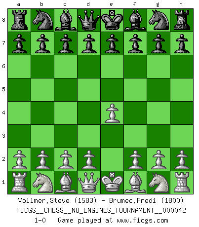 Last move : 1-0 2011 July 14 20:22:16 [Event "FICGS__CHESS__NO_ENGINES_TOURNAMENT__000042"] [Site "FICGS"] [Date "2011.06.04"] [Round "1"] [White "Vollmer,Steve"] [Black "Brumec,Fredi"] [Result "1-0"] [WhiteElo "1583"] [BlackElo "1800"] 1.e4 1-0 This chess game has been lost on time (started : 2011.06.04 12:47:54) King's pawn Opening Player White won this chess game. Follow this game move after move (download)Blessed be the memory of him who gave the world this immortal game. (A. G. Gardiner) Es ist nicht das erste mal, dass sich die FIDE dem Arabischen Geld gebeugt hat (über die FIDE WM 2004 in Lybien). (Larry Evans) No es tiempo de jugar al Ajedrez cuando la casa esta en llamas. (Proverbio Italiano) Nous vivons dans un monde échiquéen : chaque jour qui passe est un défi à relever. (Philosophe Sasha) Art is not a thing, it is a way. (Elbert Hubbard)