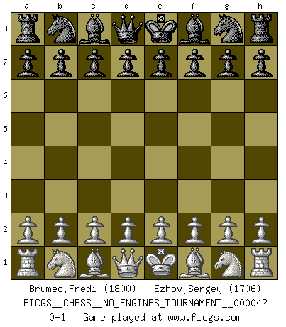 Last move : 0-1 2011 July 14 20:22:16 [Event "FICGS__CHESS__NO_ENGINES_TOURNAMENT__000042"] [Site "FICGS"] [Date "2011.06.04"] [Round "1"] [White "Brumec,Fredi"] [Black "Ezhov,Sergey"] [Result "0-1"] [WhiteElo "1800"] [BlackElo "1706"] 0-1 This chess game has been lost on time (started : 2011.06.04 12:47:54) Player Black won this chess game. Follow this game move after move (download)I don't believe in psychology. I believe in good moves. (Bobby Fischer) Immer nach dem besten Zug zu suchen ist ziemlich unpraktisch. (Nigel Short) La mitad de las variaciones que son calculadas en una partida de torneo, resultan ser completamente superfluas. Desafortunadamente, nadie sabe por adelantado cual mitad. (Jan Tinman) Seul un grand joueur sait à quel point il joue faiblement. (Xavier Tartacover) To be champion requires more than simply being a strong player; one has to be a strong human being as well. (Anatoly Karpov)