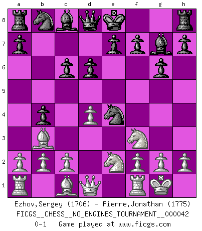 Last move : 0-1 2011 July 31 9:3:49 [Event "FICGS__CHESS__NO_ENGINES_TOURNAMENT__000042"] [Site "FICGS"] [Date "2011.06.04"] [Round "1"] [White "Ezhov,Sergey"] [Black "Pierre,Jonathan"] [Result "0-1"] [WhiteElo "1706"] [BlackElo "1775"] 1.e4 d6 2.d4 Nf6 3.Nc3 g6 4.Nf3 Bg7 5.Bc4 c6 6.O-O b5 7.Bb3 b4 8.Ne2 Nxe4 0-1 This chess game has been lost on time (started : 2011.06.04 12:47:54) Pirc : Classical (Two knights) system Kingside Castling by player White (move 6) Player Black won this chess game. Follow this game move after move (download)It began to feel as though you were playing against Chess itself. - On playing against Robert Fischer. (Walter Shipman) Wie, soll nun auch die Opposition abgeschafft werden? Ja, es tut mir leid, Ihnen diesen Schmerz nicht ersparen zu können. (Aaron Nimzowitsch) Solo el jugador con la iniciativa tiene el derecho a atacar. (Wilhelm Steinitz) Des idées, des idées, j'en ai cent, j'en ai mille. Des bonnes, des mauvaises, applicables, irréalisables... Il suffit de faire le tri ! (Roos) Either move or be moved. (Ezra Pound)