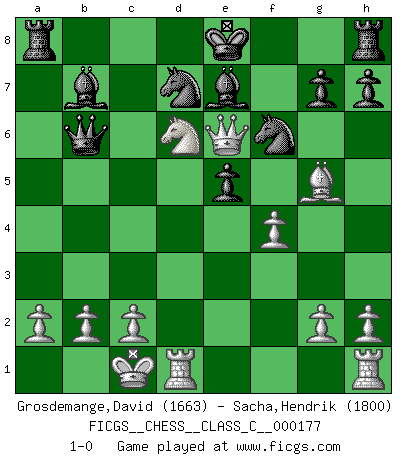 Last move : 1-0 2011 September 28 23:10:19 [Event "FICGS__CHESS__CLASS_C__000177"] [Site "FICGS"] [Date "2011.06.04"] [Round "1"] [White "Grosdemange,David"] [Black "Sacha,Hendrik"] [Result "1-0"] [WhiteElo "1663"] [BlackElo "1800"] 1.e4 c5 2.Nf3 d6 3.d4 cxd4 4.Nxd4 Nf6 5.Nc3 a6 6.Bg5 e6 7.f4 Nbd7 8.Qf3 Qc7 9.O-O-O b5 10.e5 Bb7 11.Qh3 dxe5 12.Nxe6 fxe6 13.Qxe6+ Be7 14.Bxb5 axb5 15.Nxb5 Qb6 16.Nd6+ 1-0 Sicilian : Najdorf, 7.f4 Queenside Castling by player White (move 9) Player White won this chess game. Follow this game move after move (download)In Chess, at least, the brave inherit the earth. (Edmar Mednis) Ein Kibitz ist einer, der deinem Gegner gute Ratschläge gibt. (Andrew Soltis) Botvinnik trataba de restarle el misterio al Ajedrez, siempre relacionandolo a situaciones de la vida ordinaria. El gustaba de llamar al Ajedrez un típico problema inexacto similar a aquellos de los cuales la gente siempre tiene que enfrentarse en la vida cotidiana. (Garry Kasparov) Les sacrifices démontrent seulement que quelqu'un a gaffé. (Savielly Tartacover) Fame, I have already. Now I need the money. (an elderly Steinitz)