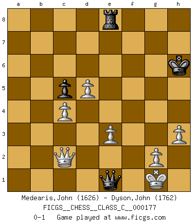 Last move : 0-1 2011 August 7 7:44:35 [Event "FICGS__CHESS__CLASS_C__000177"] [Site "FICGS"] [Date "2011.06.04"] [Round "1"] [White "Medearis,John"] [Black "Dyson,John"] [Result "0-1"] [WhiteElo "1626"] [BlackElo "1762"] 1.d4 d5 2.Nf3 Nf6 3.c4 c6 4.e3 Bf5 5.Nc3 e6 6.Nh4 Bg6 7.Nxg6 hxg6 8.h3 Nbd7 9.Bd2 Be7 10.Qc2 Qc7 11.a4 g5 12.cxd5 exd5 13.a5 a6 14.e4 dxe4 15.Bxg5 Bb4 16.Be2 Bxa5 17.O-O Bxc3 18.bxc3 O-O 19.c4 Qd6 20.Be3 Rfe8 21.Rfb1 c5 22.d5 b5 23.Ra5 Reb8 24.Rba1 b4 25.Bd1 Rb6 26.Qb2 Rc8 27.Bb3 Nh5 28.Qe2 g6 29.Qd2 f5 30.Qa2 Ra8 31.Ba4 f4 32.Bxd7 fxe3 33.Be6+ Kh7 34.fxe3 b3 35.Qb2 Qg3 36.Qd2 Rd8 37.Bg4 Rf8 38.Bxh5 b2 39.Rb1 Rbf6 40.Rxa6 Rxa6 41.Qxb2 Kh6 42.Bxg6 Rxg6 43.Rc1 Rgf6 44.Qb1 Rf2 45.Qxe4 Re8 46.Rc2 Rxc2 47.Qxc2 Qe1+ 0-1 Queen's pawn game Kingside Castling by player White (move 17) Kingside Castling by player Black (move 18) Player Black won this chess game. Follow this game move after move (download)It's always better to sacrifice your opponent's men. (Savielly Tartakover) Du musst Deinen Gegner in einen tiefen dunklen Wald führen wo 2+2=5 ist und wo der Weg, der wieder hinausführt, nur breit genug für einen ist. (Mikhail Nekhemyevich Tal) Yo jugué Ajedrez con el y a veces le pude haber ganado solo que siempre devuelve su última jugada y juega la partida de manera diferente. (Mark Twain) Mais l'homme est une créature légère et illogique : semblable au joueur d'échecs, il n'aime que le processus du but à atteindre, non le but lui-même. (Dostoïevsky) A specialist learns more and more about less and less until he knows everything about nothing. (Nicholas Murray Butler)