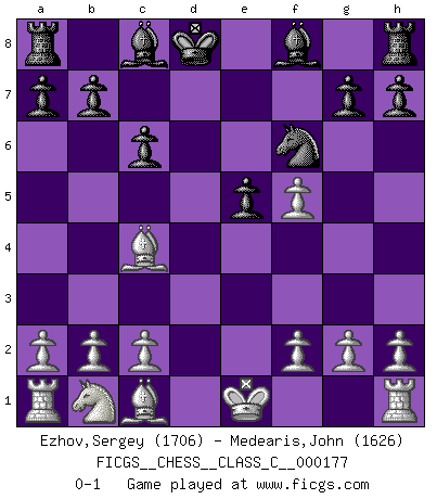 Last move : 0-1 2011 July 18 20:26:20 [Event "FICGS__CHESS__CLASS_C__000177"] [Site "FICGS"] [Date "2011.06.04"] [Round "1"] [White "Ezhov,Sergey"] [Black "Medearis,John"] [Result "0-1"] [WhiteElo "1706"] [BlackElo "1626"] 1.e4 c5 2.Nf3 Nc6 3.d4 cxd4 4.Nxd4 e5 5.Nxc6 dxc6 6.Qxd8+ Kxd8 7.Bc4 f5 8.exf5 Nf6 0-1 This chess game has been lost on time (started : 2011.06.04 12:50:8) Sicilian : Labourdonnais-Loewenthal variation Player Black won this chess game. Follow this game move after move (download)You are for me the Queen on d8 and I am the Pawn on d7 !! (Eduard Gufeld) Es hat in meinem Leben Zeiten gegeben, in denen das Schachspiel, wenn nicht zum Lebenszweck, so doch zu einem regelrechten Lebensersatz geworden ist. Man fühlt sich in solchen Zeiten nicht so, als besäße man eine göttliche Gabe, sondern eher so, als sei man von ihr besessen. (Garry Kasparov) La estratégia requiere pensar, la táctica requiere observación. (Max Euwe) Karpov est une pièce de musée. (Garry Kasparov) Fear is the path to the dark side. Fear leads to anger; anger leads to hate; hate leads to suffering. I sense much fear in you. (Master Yoda in Star Wars ep.1)
