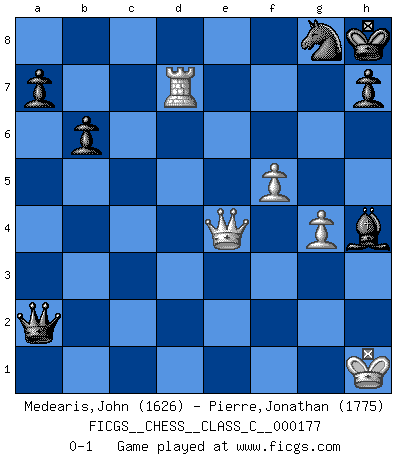 Last move : 0-1 2011 October 13 6:27:41 [Event "FICGS__CHESS__CLASS_C__000177"] [Site "FICGS"] [Date "2011.06.04"] [Round "1"] [White "Medearis,John"] [Black "Pierre,Jonathan"] [Result "0-1"] [WhiteElo "1626"] [BlackElo "1775"] 1.e4 d6 2.Nf3 Nf6 3.Nc3 g6 4.d4 Bg7 5.Bd3 O-O 6.O-O Bg4 7.Be2 Nbd7 8.h3 Bxf3 9.Bxf3 e5 10.d5 Ne8 11.Be3 f5 12.exf5 gxf5 13.Qd3 e4 14.Bxe4 fxe4 15.Nxe4 Nef6 16.Ng5 Ne5 17.Qb3 Qc8 18.Ne6 Rf7 19.Rad1 Ng6 20.Bd4 b6 21.f4 Qd7 22.f5 Ne5 23.Bxe5 dxe5 24.Ng5 R7f8 25.d6 Kh8 26.dxc7 Qxc7 27.Ne6 Qc6 28.Nxf8 Rxf8 29.Kh1 e4 30.Rfe1 Bh6 31.Qe6 Qxc2 32.Rd8 Qxb2 33.Red1 Ng8 34.Rxf8 Bxf8 35.Qxe4 Qxa2 36.g4 Be7 37.Rd7 Bf6 38.h4 Bxh4 0-1 King's pawn Opening Kingside Castling by player Black (move 5) Kingside Castling by player White (move 6) Player Black won this chess game. Follow this game move after move (download)The older I grow, the more I value Pawns. (Keres) Es hat in meinem Leben Zeiten gegeben, da ich sehr nahe daran war zu glauben, daß ich auch nicht eine einzige Schachpartie verlieren könnte. (José Raúl Capablanca) Estaba muy claro de que el punto vulnerable del Gran Maestro Americano (Bobby Fischer) radicaba en las posiciones de doble filo, colgantes, irracionales, donde el siempre falló en encontrar un triunfo aún en una posición de clara victoria. (Efim Geller) Le joueur d'Echecs qui veut atteindre le top est obligé de développer son propre credo créatif. Alexeï Stepanovicth Souétine. Il est facile d'écrire des livres ! Ce qui est difficile, c'est de jouer ! (Alexeï Stepanovicth Souétine) Whoever said the pen is mightier than the sword obviously never encountered automatic weapons. (US General Douglas MacArthur)