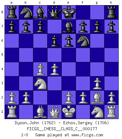 Last move : 1-0 2011 July 16 8:22:53 [Event "FICGS__CHESS__CLASS_C__000177"] [Site "FICGS"] [Date "2011.06.04"] [Round "1"] [White "Dyson,John"] [Black "Ezhov,Sergey"] [Result "1-0"] [WhiteElo "1762"] [BlackElo "1706"] 1.c4 d6 2.Nc3 Nf6 3.g3 e6 4.Bg2 Be7 5.d4 1-0 This chess game has been lost on time (started : 2011.06.04 12:50:8) English Opening Player White won this chess game. Follow this game move after move (download)I give 98 percent of my mental energy to Chess. Others give only 2 percent. (Bobby Fischer) Wie bekannt hörte Morphy 1859 auf, Schach zu spielen. Seine Enttäuschung galt nicht so sehr dem Schach, wie den Schachspielern. (Robert James Fischer) Aquel que teme a un Peón de Reina aislado, debería de retirarse del Ajedrez. (Siegbert Tarrasch) Les erreurs sont comme les malheurs, elles n'arrivent jamais seules. (Siegbert Tarrasch) Don't be irreplaceable, if you can't be replaced, you can't be promoted. (Dan Rotaru)