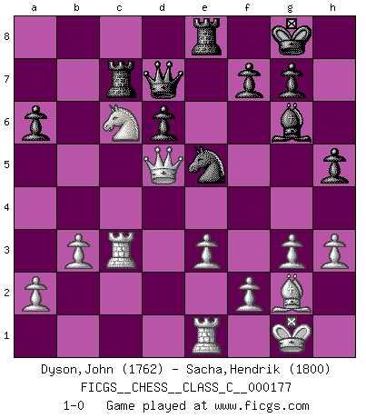 Last move : 1-0 2011 September 29 11:10:55 [Event "FICGS__CHESS__CLASS_C__000177"] [Site "FICGS"] [Date "2011.06.04"] [Round "1"] [White "Dyson,John"] [Black "Sacha,Hendrik"] [Result "1-0"] [WhiteElo "1762"] [BlackElo "1800"] 1.c4 Nf6 2.g3 Nc6 3.Bg2 e5 4.Nc3 Bb4 5.Nd5 Bc5 6.e3 d6 7.Ne2 O-O 8.O-O a6 9.b3 Bg4 10.h3 Bf5 11.d4 Ba7 12.Bb2 Re8 13.dxe5 Nxd5 14.cxd5 Nxe5 15.Bd4 h5 16.Bxa7 Rxa7 17.Rc1 Qd7 18.Nd4 Bd3 19.Re1 Bg6 20.Rc3 c5 21.dxc6 bxc6 22.Nxc6 Rc7 23.Qd5 1-0 English, 1...Nf6 (Anglo-Indian defense) Kingside Castling by player Black (move 7) Kingside Castling by player White (move 8) Player White won this chess game. Follow this game move after move (download)Dazzling combinations are for the many, shifting wood is for the few. (Georg Kieninger) Schach ist das Spiel, das die Verrückten gesund hält. (Albert Einstein) Los finales de Peón son del Ajedrez lo que el cesped es del Golf. (Cecil Purdy) Demandez au pauvre Cg1 ce qu'il en pense. Eduard Gufeld à propos de la variante Saemisch de l'Est-Indienne. I don't believe in psychology. I believe in good moves. (Bobby Fischer)