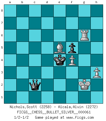 Last move : 1/2-1/2 2011 June 4 19:39:18 [Event "FICGS__CHESS__BULLET_SILVER__000061"] [Site "FICGS"] [Date "2011.06.04"] [Round "1"] [White "Nichols,Scott"] [Black "Alcala,Alvin"] [Result "1/2-1/2"] [WhiteElo "2258"] [BlackElo "2272"] 1.e4 c5 2.b3 Nc6 3.Bb2 d6 4.Nf3 e6 5.d4 cxd4 6.Nxd4 Nf6 7.Bd3 Be7 8.O-O O-O 9.c4 Nd7 10.Nc2 Nc5 11.Nc3 Bf6 12.Ne3 Be5 13.Qd2 Qg5 14.Rad1 Nd4 15.Be2 Qf4 16.g3 Nf3+ 17.Bxf3 Qxf3 18.Nc2 Rd8 19.Ne1 Qh5 20.Qe3 Bd7 21.Nd3 Nxd3 22.Rxd3 Bc6 23.Rd2 Rd7 24.a4 f5 25.f4 Bf6 26.b4 Bxc3 27.Qxc3 Qf7 28.exf5 exf5 29.b5 Be4 30.Rc1 Rc8 31.a5 h6 32.Qd4 Kh7 33.Rc3 d5 34.c5 Rdc7 35.Ba3 Ra8 36.b6 Rc6 37.Bb2 h5 38.h3 Rac8 39.bxa7 Ra8 40.Qb4 Rxa7 41.Ra3 h4 42.gxh4 Qg6+ 43.Kh2 Qh6 44.Be5 Rg6 45.Qd4 Qxh4 46.Qf2 Qe7 47.Rb2 R7a6 48.R3a2 Qd7 49.Ra3 Kg8 50.Bd4 Rg2+ 51.Qxg2 Bxg2 52.Rxg2 g6 53.Rb2 Re6 54.Rab3 Qa4 55.Be5 d4 56.Rxb7 d3 57.Rb8+ Kf7 58.R8b7+ Kf8 59.Rb8+ Re8 60.a6 Rxb8 61.Rxb8+ Ke7 62.Rb7+ Ke8 63.a7 d2 64.Rb8+ Kd7 65.a8Q Qxa8 66.Rxa8 d1Q 67.Ra7+ Kc6 68.Ra6+ Kxc5 69.Rxg6 Qd2+ 70.Kg3 Qe1+ 71.Kh2 Kd5 72.Kg2 Qc1 73.Kf2 Ke4 74.Kg2 Qc2+ 1/2-1/2 Sicilian defense Kingside Castling by player White (move 8) Kingside Castling by player Black (move 8) Promotion Queen by player White (move 65) 10 pieces endgame at move 66 : White KRBPPP , Black KPPP WHITE : King + 1 Rook 1 Bishop 3 Pawns BLACK : King + 3 Pawns Promotion Queen by player Black (move 66) 9 pieces endgame at move 68 : White KRBPP , Black KQPP WHITE : King + 1 Rook 1 Bishop 2 Pawns BLACK : King + 1 Queen 2 Pawns 8 pieces endgame at move 69 : White KRBPP , Black KQP WHITE : King + 1 Rook 1 Bishop 2 Pawns BLACK : King + 1 Queen 1 Pawn This chess game ended in a draw. Follow this game move after move (download)A great player and a great example for many. His book My 60 Memorable Games had a big impact on me. It is a shame he didn't continue to enrich the world of chess with his unparalleled understanding after 1972. (Jan Timman, about Bobby Fischer's death) Ich bin es gewohnt, das die Jugend mir überhaupt keinen Respekt entgegenbringt. (Alexander Morozewich) El Ajedrez te enseña a controlarl la excitación inicial que sientes cuando vez algo que parece bueno y te enseña a pensar objetivamente cuando te encuentras en problemas. (Stanley Kubrick) Les échecs, c'est l'art d'analyser. (Mikhail Botvinnik) The leaves of memory seemed to make a mournful rustling in the dark. (Henry Wadsworth Longfellow)