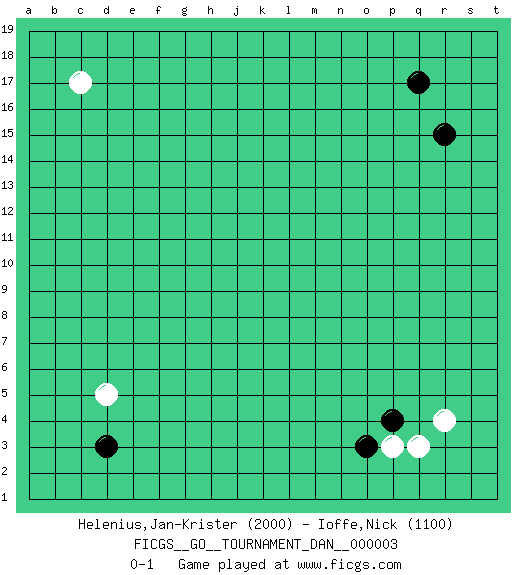 Last move : 0-1 2007 February 12 16:9:10 [Event "FICGS__GO__TOURNAMENT_DAN__000003"] [Site "FICGS"] [Date "2006.12.24"] [Round "1"] [Black "Helenius,Jan-Krister"] [White "Ioffe,Nick"] [Result "0-1"] [Rating 1 "2000"] [Rating 2 "1100"] 1.r15 r4 2.q17 c17 3.d3 d5 4.p4 p3 5.o3 q3 0-1 This go game has been lost on time (started : 2006.12.24 7:56:35) Here are the names of the openings (joseki) played in the four corners : Corner d4 : d3 d5 Komoku (Somok, Xiao~mu`) 3-4 Point. The komoku (3-4) point is the traditional corner enclosure move.. Ikken Takagakari (Hankan Nop'dakeolch'im, Yi Gaogua`jiao~, 1-Space High Approach). The 5-4 approach move has become more popular in modern times, as modern Go emphasizes speed and influence. Corner q4 : r4 p4 Komoku (Somok, Xiao~mu`) 3-4 Point. The komoku (3-4) point is the traditional corner enclosure move.. Ikken Takagakari (Hankan Nop'dakeolch'im, Yi Gaogua`jiao~, 1-Space High Approach). The 5-4 approach move has become more popular in modern times, as modern Go emphasizes speed and influence. Player White won this Go (weiqi, baduk) game. Follow this game move after move (download)One point in the center is worth ten in the corner. (Anonymous) There are two kinds of people in the world, my friend. Those who have a loaded gun and those who dig. You dig ! (Blondie in The Good, The Bad and The Ugly)