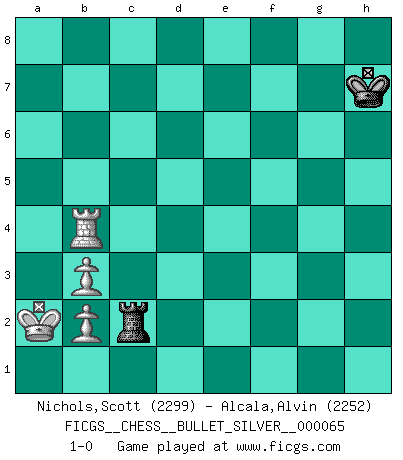 Last move : 1-0 2011 June 5 20:5:39 [Event "FICGS__CHESS__BULLET_SILVER__000065"] [Site "FICGS"] [Date "2011.06.05"] [Round "1"] [White "Nichols,Scott"] [Black "Alcala,Alvin"] [Result "1-0"] [WhiteElo "2299"] [BlackElo "2252"] 1.e4 c5 2.Nf3 d6 3.d4 cxd4 4.Nxd4 Nf6 5.Nc3 a6 6.Bg5 e6 7.f4 Qb6 8.Nb3 Be7 9.Qf3 Nc6 10.O-O-O Qc7 11.Kb1 h6 12.Bh4 O-O 13.Bd3 Nb4 14.g4 b5 15.Bxf6 Bxf6 16.e5 Bb7 17.Be4 d5 18.exf6 dxe4 19.Qh3 Nd5 20.fxg7 Kxg7 21.Nxd5 Bxd5 22.f5 Bxb3 23.f6+ Kxf6 24.Qxh6+ Ke7 25.axb3 Qe5 26.Qh4+ Ke8 27.Qf2 Rc8 28.h4 Ke7 29.Qe3 Rfd8 30.h5 Kf8 31.Rdf1 Kg8 32.h6 Rd7 33.Rh5 Qd4 34.Rg5+ Kh8 35.Qxd4+ Rxd4 36.Rxf7 Rg8 37.Rxg8+ Kxg8 38.Re7 e3 39.h7+ Kh8 40.Rxe6 Rxg4 41.Rxe3 Kxh7 42.Re6 b4 43.Rxa6 Rg1+ 44.Ka2 Rg2 45.Rb6 Rxc2 46.Rxb4 1-0 Sicilian : Najdorf, 7...Qb6 Queenside Castling by player White (move 10) Kingside Castling by player Black (move 12) 10 pieces endgame at move 41 : White KRPPPP , Black KRPP WHITE : King + 1 Rook 4 Pawns BLACK : King + 1 Rook 2 Pawns 9 pieces endgame at move 41 : White KRPPP , Black KRPP WHITE : King + 1 Rook 3 Pawns BLACK : King + 1 Rook 2 Pawns 8 pieces endgame at move 43 : White KRPPP , Black KRP WHITE : King + 1 Rook 3 Pawns BLACK : King + 1 Rook 1 Pawn 7 pieces endgame at move 45 : White KRPP , Black KRP WHITE : King + 1 Rook 2 Pawns BLACK : King + 1 Rook 1 Pawn 6 pieces endgame at move 46 : White KRPP , Black KR WHITE : King + 1 Rook 2 Pawns BLACK : King + 1 Rook Player White won this chess game. Follow this game move after move (download)Look at Garry Kasparov. After he loses, invariably he wins the next game. He just kills the next guy. That's something that we have to learn to be able to do. (Maurice Ashley) Über Kasparov: Es ist offensichtlich, daß er in einem totalitären Staat aufwuchs und deshalb zu diktatorischen Zügen neigt. (Viktor Kortschnoi) Diferente gente reacciona diferentemente en aceptar la derrota. (Bobby Fischer) Si le désir cupide (et stupide) de gagner est une inépuisable source de souffrance, une combinaison brillante sur l'échiquier est une découverte : le coquelicot qui s'épanouit lorsque apparaît la Voie Lactée. (Arrabal) History is a gallery of pictures in which there are few originals and many copies. (Alexis de Tocqueville)
