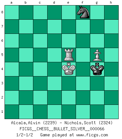 Last move : 1/2-1/2 2011 June 5 20:55:47 [Event "FICGS__CHESS__BULLET_SILVER__000066"] [Site "FICGS"] [Date "2011.06.05"] [Round "1"] [White "Alcala,Alvin"] [Black "Nichols,Scott"] [Result "1/2-1/2"] [WhiteElo "2239"] [BlackElo "2324"] 1.e4 e6 2.d4 d5 3.Nc3 Nf6 4.e5 Nfd7 5.f4 c5 6.Nf3 Nc6 7.Be3 Be7 8.Qd2 O-O 9.Be2 a6 10.O-O b5 11.Nd1 b4 12.Nf2 Qb6 13.c4 bxc3 14.bxc3 Rb8 15.Bd3 Qa5 16.Rab1 Rxb1 17.Bxb1 g6 18.Ng4 Rd8 19.Nh6+ Kg7 20.f5 exf5 21.Bxf5 cxd4 22.Nxd4 Ncxe5 23.Qf2 f6 24.Ne6+ Kh8 25.Nxd8 Qxd8 26.Be6 Nb8 27.Bxc8 Qxc8 28.Bd4 Nbd7 29.h3 Kg7 30.Ng4 Qg8 31.Ne3 Qe6 32.Rd1 Bf8 33.Kh1 Bd6 34.Qb2 Nc5 35.Bxc5 Bxc5 36.Qd2 Bxe3 37.Qxe3 h5 38.Qc5 g5 39.Qxd5 Qc8 40.Rf1 Qxc3 41.Qb7+ Kg6 42.Qxa6 Nd3 43.Qe6 Nf4 44.Qe4+ Kh6 45.Rb1 h4 46.a4 Qd2 47.Rb8 Qc1+ 48.Kh2 Ng6 49.Rb7 Qc5 50.Rd7 Qc3 51.Rd1 Kg7 52.Qf5 Kh6 53.Qd3 Qc6 54.a5 Qc7+ 55.Qd6 Qxa5 56.Qxf6 Qa3 57.Qd6 Qb2 58.Qc7 Qf6 59.Rd7 Qf4+ 60.Qxf4 Nxf4 61.Rd6+ Kh5 62.g3 hxg3+ 63.Kxg3 Ng6 64.Rd5 Ne7 65.Rb5 Ng6 66.Ra5 Nh4 67.Rc5 Ng6 68.Rc7 Ne5 69.Rg7 Nc6 70.Rb7 Nd8 71.Re7 Nc6 72.Re8 Nd4 73.Re5 Nc6 74.Rc5 Nd4 75.h4 Ne2+ 76.Kf3 Nd4+ 77.Ke3 Ne6 78.Re5 Nf8 79.hxg5 Kh4 80.Ke4 Kg4 81.Rb5 Ng6 82.Ra5 Nf8 83.Re5 1/2-1/2 French : Steinitz, Boleslavsky variation Kingside Castling by player Black (move 8) Kingside Castling by player White (move 10) 10 pieces endgame at move 56 : White KQRPP , Black KQNPP WHITE : King + 1 Queen 1 Rook 2 Pawns BLACK : King + 1 Queen 1 Knight 2 Pawns 9 pieces endgame at move 60 : White KQRPP , Black KNPP WHITE : King + 1 Queen 1 Rook 2 Pawns BLACK : King + 1 Knight 2 Pawns 8 pieces endgame at move 60 : White KRPP , Black KNPP WHITE : King + 1 Rook 2 Pawns BLACK : King + 1 Knight 2 Pawns 7 pieces endgame at move 62 : White KRP , Black KNPP WHITE : King + 1 Rook 1 Pawn BLACK : King + 1 Knight 2 Pawns 6 pieces endgame at move 63 : White KRP , Black KNP WHITE : King + 1 Rook 1 Pawn BLACK : King + 1 Knight 1 Pawn 5 pieces endgame at move 79 : White KRP , Black KN WHITE : King + 1 Rook 1 Pawn BLACK : King + 1 Knight This chess game ended in a draw. Follow this game move after move (download)Is Bobby Fischer quite sane ? (Salo Flohr) Glücklicherweise sind Großmeister Ruben Fines reine Schachbücher weniger phallozentrisch [als seine Schachpsychologie] und deswegen auch weniger lächerlich. (Nigel Short) Buenas posiciones no logran ganar juegos, buenas movidas sí. (Gerald Abrahams) Karpov est une pièce de musée. (Garry Kasparov) I feel so... helpless. (C-3PO in Star Wars ep.3)