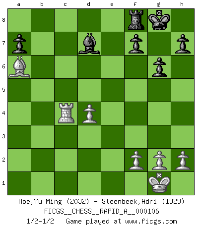 Last move : 1/2-1/2 2011 July 2 8:27:56 [Event "FICGS__CHESS__RAPID_A__000106"] [Site "FICGS"] [Date "2011.06.06"] [Round "1"] [White "Hoe,Yu Ming"] [Black "Steenbeek,Adri"] [Result "1/2-1/2"] [WhiteElo "2032"] [BlackElo "1929"] 1.e4 e5 2.Nf3 Nf6 3.d4 Nxe4 4.Bd3 d5 5.Nxe5 Nd7 6.Nxd7 Bxd7 7.O-O Bd6 8.c4 c6 9.cxd5 cxd5 10.Nc3 Nxc3 11.bxc3 O-O 12.Qh5 g6 13.Qxd5 Qc7 14.Bh6 Rfd8 15.Qg5 Qxc3 16.Rfd1 Bf8 17.Bxf8 Rxf8 18.Rac1 Qa3 19.Be4 Rac8 20.Bxb7 Rxc1 21.Qxc1 Qxa2 22.Qc3 Qa4 23.Ra1 Qb5 24.Ba6 Qc6 25.Qxc6 Bxc6 26.Rc1 Ba4 27.Rc4 Bd7 1/2-1/2 Petrov : Modern attack, Symmetrical variation Kingside Castling by player White (move 7) Kingside Castling by player Black (move 11) This chess game ended in a draw. Follow this game move after move (download)Chess is war over the board. The object is to crush the opponents mind. (Bobby Fischer) Wie kann ich Remis annehmen? Ich weiß ja gar nicht, wie ich stehe! (Fritz Sämisch) Cuando veas una buena jugada, trata de encontrar otra mejor. (Emanuel Lasker) Vous n'êtes pas toujours obligé de jouer le meilleur coup. Un coup doit être actif, entreprenant, correct et beau ! (David Bronstein) Plans are ideas that never come to fruition. (Daniel Parmet)