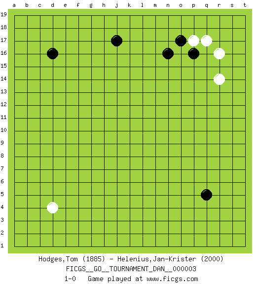Last move : 1-0 2007 February 12 16:9:10 [Event "FICGS__GO__TOURNAMENT_DAN__000003"] [Site "FICGS"] [Date "2006.12.24"] [Round "1"] [Black "Hodges,Tom"] [White "Helenius,Jan-Krister"] [Result "1-0"] [Rating 1 "1885"] [Rating 2 "2000"] 1.q5 r16 2.d16 d4 3.p16 p17 4.o17 q17 5.n16 r14 6.j17 1-0 This go game has been lost on time (started : 2006.12.24 7:56:35) Here are the names of the openings (joseki) played in the four corners : Corner q16 : r16 p16 Komoku (Somok, Xiao~mu`) 3-4 Point. The komoku (3-4) point is the traditional corner enclosure move.. Ikken Takagakari (Hankan Nop'dakeolch'im, Yi Gaogua`jiao~, 1-Space High Approach). The 5-4 approach move has become more popular in modern times, as modern Go emphasizes speed and influence. Player Black won this Go (weiqi, baduk) game. Follow this game move after move (download)I really believe that Go is destined to take the place of Chess as the leading intellectual game of the Occident, just as it has reigned supreme in the Orient for some four thousand years. (Edward Lasker, international chess master) If everyone is thinking alike, then somebody isn't thinking. (US General George S. Patton)