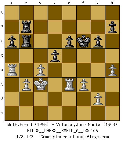 Last move : 1/2-1/2 2011 July 7 11:21:36 [Event "FICGS__CHESS__RAPID_A__000106"] [Site "FICGS"] [Date "2011.06.06"] [Round "1"] [White "Wolf,Bernd"] [Black "Velasco,Jose Maria"] [Result "1/2-1/2"] [WhiteElo "1966"] [BlackElo "1903"] 1.e4 c5 2.Nf3 d6 3.Bb5+ Bd7 4.Bxd7+ Qxd7 5.c4 Nc6 6.Nc3 Nf6 7.d4 cxd4 8.Nxd4 g6 9.f3 Bg7 10.Be3 O-O 11.O-O a6 12.a4 Qc7 13.b3 Rfc8 14.Nd5 Nxd5 15.exd5 Bxd4 16.Bxd4 Nxd4 17.Qxd4 Qd8 18.a5 Rab8 19.Rfe1 b6 20.axb6 Qxb6 21.Qxb6 Rxb6 22.Ra3 Rc7 23.Re3 Kg7 24.Kf2 Kf6 25.Ke2 e6 26.dxe6 fxe6 27.Kd2 d5 28.Kc3 Rbc6 29.Ra4 Rb7 30.h4 Rcb6 1/2-1/2 Sicilian : Canal-Sokolsky attack, Sokolsky variation Kingside Castling by player Black (move 10) Kingside Castling by player White (move 11) This chess game ended in a draw. Follow this game move after move (download)Some sacrifices are sound; the rest are mine. (Mikhail Tal) Im Hotelzimmer gab es nur zwei Schaben. (Über die Turnierbedingungen) (Peter Swidler) Una buena memoria, concentración, imaginación y una fuerte voluntad, se requiere para llegar a ser un buen jugador. (Bobby Fischer) RxDa4 pat (...) A married woman is like a fish riding a bicycle. (Rodolfo d'Ettorre)