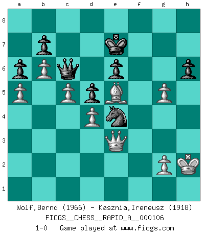 Last move : 1-0 2011 August 22 12:50:41 [Event "FICGS__CHESS__RAPID_A__000106"] [Site "FICGS"] [Date "2011.06.06"] [Round "1"] [White "Wolf,Bernd"] [Black "Kasznia,Ireneusz"] [Result "1-0"] [WhiteElo "1966"] [BlackElo "1918"] 1.f4 d5 2.Nf3 Bf5 3.e3 e6 4.b3 Nf6 5.Bb2 Be7 6.Be2 h6 7.O-O O-O 8.Ne5 Nbd7 9.c4 c6 10.Nc3 Rc8 11.d4 c5 12.Kh1 cxd4 13.exd4 Ne4 14.Nxe4 Bxe4 15.Bd3 Nf6 16.c5 Bxd3 17.Qxd3 Ne4 18.b4 Bf6 19.Kg1 Bxe5 20.fxe5 a6 21.a4 Ra8 22.Rf4 Qd7 23.Qe2 Rab8 24.b5 Qc7 25.b6 Qc6 26.Bc1 Rbc8 27.Rf1 Qd7 28.Ra3 f5 29.exf6 Nxf6 30.Raf3 Ne4 31.Rxf8+ Rxf8 32.Rxf8+ Kxf8 33.Qc2 Qc6 34.Bf4 g5 35.Be5 Kf7 36.a5 Kg6 37.Qc1 Kf7 38.h4 Ke7 39.Kh2 Kf7 40.Qe3 Ke7 41.hxg5 1-0 Bird's Opening Kingside Castling by player White (move 7) Kingside Castling by player Black (move 7) Player White won this chess game. Follow this game move after move (download)Chess is a foolish expedient for making idle people believe they are doing something very clever when they are only wasting their time. (George Bernard Shaw) Versuche, dich von der Sklaverei der Eröffnungsvarianten zu befreien. Stattdessen soll man gewisse Typenpositionen erlernen, die man eingehend analysiert. (Aaron Nimzowitsch) En el Ajedrez, tal como en la vida, las bendiciones de hoy pueden ser el veneno del mañana. (Assaic) Avant la finale, les dieux ont créé le milieu de partie. (Tarrasch) May the force be with you. (Han Solo in Star Wars ep.4)