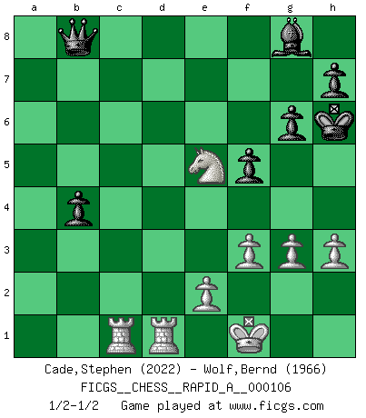 Last move : 1/2-1/2 2011 September 16 12:6:40 [Event "FICGS__CHESS__RAPID_A__000106"] [Site "FICGS"] [Date "2011.06.06"] [Round "1"] [White "Cade,Stephen"] [Black "Wolf,Bernd"] [Result "1/2-1/2"] [WhiteElo "2022"] [BlackElo "1966"] 1.d4 Nf6 2.c4 e6 3.Nf3 b6 4.g3 Bb7 5.Bg2 Be7 6.O-O O-O 7.Re1 d5 8.cxd5 exd5 9.Nc3 Na6 10.Bf4 c5 11.dxc5 Nxc5 12.Rc1 Ne6 13.Be5 Ng4 14.Bd4 Nf6 15.Qb3 Ne4 16.Red1 Rc8 17.Bh3 N6c5 18.Qc2 Ne6 19.Bf5 Bf6 20.Bxe4 dxe4 21.Bxf6 Qxf6 22.Nxe4 Bxe4 23.Qxc8 Rxc8 24.Rxc8+ Nf8 25.R1d8 g6 26.Rxf8+ Kg7 27.Rg8+ Kh6 28.Rc3 Qe6 29.a3 Qa2 30.Re3 Qxb2 31.Kg2 f5 32.Rc8 a5 33.h3 Qe5 34.Rec3 Qd6 35.Rb3 Qe6 36.R8c3 Bd5 37.Rb5 Qf6 38.Rc1 Qd6 39.Rc2 Be4 40.Rc3 Bc6 41.Rb1 b5 42.R1b3 Qd1 43.Re3 Qd6 44.Rbd3 Qc7 45.Rd4 Qa7 46.Rd1 Qc5 47.Kf1 b4 48.axb4 axb4 49.Nd4 Bd5 50.Nb3 Qc6 51.Nd4 Qb7 52.Kg1 Bc4 53.Rb1 Qb6 54.Nf3 Qd6 55.Kg2 Qf8 56.Rc1 Qf7 57.Ne5 Bd5+ 58.f3 Qa7 59.Rd3 Qa2 60.Kf2 Bg8 61.R3d1 Qa7+ 62.Kf1 Qb8 1/2-1/2 Queen's Indian : Old Main line, 6.O-O Kingside Castling by player White (move 6) Kingside Castling by player Black (move 6) This chess game ended in a draw. Follow this game move after move (download)A thorough understanding of the typical mating continuations makes the most complicated sacrificial combinations leading up to them not only not difficult, but almost a matter of course. (Siegbert Tarrasch) Schach ist die gewalttätigste aller Sportarten. (Garry Kasparov) El Ajedrez moderno está demasiado preocupado con cosas como la estructura de Peones. Olvidenlo, el Jaque Mate termina la partida. (Nigel Short) Les Echecs représentent une sphère d'idées créatrices basée sur la volonté des deux protagonistes. (Smyslov) No enterprise is more likely to succeed than one concealed from the enemy until it is ripe for execution. (Niccolo Machiavelli)