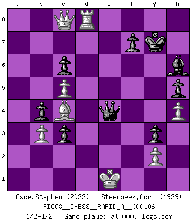 Last move : 1/2-1/2 2011 June 26 12:41:37 [Event "FICGS__CHESS__RAPID_A__000106"] [Site "FICGS"] [Date "2011.06.06"] [Round "1"] [White "Cade,Stephen"] [Black "Steenbeek,Adri"] [Result "1/2-1/2"] [WhiteElo "2022"] [BlackElo "1929"] 1.d4 d5 2.c4 c6 3.Nf3 Nf6 4.Nc3 e6 5.Bg5 h6 6.Bh4 dxc4 7.e4 g5 8.Bg3 b5 9.Be2 Bb7 10.h4 g4 11.Ne5 Nbd7 12.Nxd7 Qxd7 13.Be5 Qe7 14.O-O Rg8 15.b3 Nd7 16.Bg3 b4 17.Na4 c3 18.Qd3 h5 19.a3 a5 20.Rfd1 Rg6 21.Qc2 Bh6 22.Nc5 Nxc5 23.dxc5 e5 24.axb4 axb4 25.Rxa8+ Bxa8 26.Qa2 Bb7 27.Qa7 Qc7 28.Bxe5 Qxe5 29.Qxb7 Kf8 30.Bc4 Rf6 31.Rd8+ Kg7 32.Qc8 Rxf2 33.Kxf2 g3+ 34.Ke1 Qxe4+ 1/2-1/2 QGD Slav : 4.Nc3 Kingside Castling by player White (move 14) This chess game ended in a draw. Follow this game move after move (download)Daring ideas are like Chess men moved forward. They may be beaten, but they may start a winning game. (Johann Wolfgang von Goethe) Taktik ist was man tun muß, wenn etwas zu tun ist. Strategie ist was man tun muß, wenn nichts zu tun ist. (Savielly Grigorievitsch Tartakower) Peones: ellos son el alma de esta partida, solos forman el ataque y la defensa. (Philidor) Ce n'est pas pour s'amuser qu'il joue aux échecs : il célèbre un culte. (Vladimir Nabokov) The smarter you play, the luckier you'll be. (Mark Pilarski)