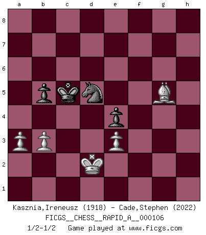 Last move : 1/2-1/2 2011 September 3 14:6:55 [Event "FICGS__CHESS__RAPID_A__000106"] [Site "FICGS"] [Date "2011.06.06"] [Round "1"] [White "Kasznia,Ireneusz"] [Black "Cade,Stephen"] [Result "1/2-1/2"] [WhiteElo "1918"] [BlackElo "2022"] 1.d4 d5 2.c4 c6 3.e3 Nf6 4.Nf3 Bf5 5.cxd5 cxd5 6.Qb3 Qc7 7.Nc3 e6 8.Bd2 Nc6 9.Rc1 Be7 10.Nh4 Bg4 11.Bd3 Bh5 12.h3 a6 13.g4 Bg6 14.Nxg6 hxg6 15.Qd1 g5 16.Qf3 Rc8 17.O-O b5 18.Qg2 Qd7 19.Ne2 Ne4 20.Bxe4 dxe4 21.Qxe4 Rxh3 22.Ng3 Rh4 23.Rc2 Nd8 24.Rxc8 Qxc8 25.Rc1 Qb8 26.Qf3 Qb6 27.a3 g6 28.Rc8 Kd7 29.Ra8 Ke8 30.Qe4 Rh7 31.Qc2 Qb7 32.Qc8 Qxc8 33.Rxc8 Rh4 34.f3 Kd7 35.Ra8 Nc6 36.Rxa6 f5 37.gxf5 gxf5 38.d5 exd5 39.Nxf5 Rc4 40.Nxe7 Nxe7 41.Ra7+ Ke6 42.Bc3 Nf5 43.Ra8 g4 44.fxg4 Rxg4+ 45.Kf2 Re4 46.Re8+ Kd6 47.Rxe4 dxe4 48.b3 Kc6 49.Be5 Kd5 50.Bc3 Kc6 51.Bf6 Kd5 52.Ke2 Kc5 53.Kd2 Kd5 54.Bg5 Kc6 55.Kc3 Kc5 56.Bf4 Ne7 57.Kd2 Kd5 58.Kc2 Kc5 59.Kc3 Nd5+ 60.Kd2 Kc6 61.Bg5 Kc5 1/2-1/2 QGD Slav defense Kingside Castling by player White (move 17) 10 pieces endgame at move 47 : White KRBPPP , Black KNPP WHITE : King + 1 Rook 1 Bishop 3 Pawns BLACK : King + 1 Knight 2 Pawns 9 pieces endgame at move 47 : White KBPPP , Black KNPP WHITE : King + 1 Bishop 3 Pawns BLACK : King + 1 Knight 2 Pawns This chess game ended in a draw. Follow this game move after move (download)Chess opens and enriches your mind. (Saudin Robovic) Wenn es im Universum noch irgendwo intelligente Lebewesen gibt, dann kennen sie Go. (Emanuel Lasker) Bobby es el jugador de Ajedrez mas fino que este país jamás haya producido. Su memoria para las movidas, su brillantez en soñar combinaciones y su feróz determinación por la victoria son algo extraño. (John Collins) Si le désir cupide (et stupide) de gagner est une inépuisable source de souffrance, une combinaison brillante sur l'échiquier est une découverte : le coquelicot qui s'épanouit lorsque apparaît la Voie Lactée. (Arrabal) Waiting for chance ? Play in casinos. (FICGS proverb)
