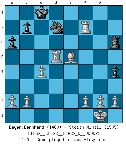Last move : 1-0 2007 January 14 12:30:36 [Event "FICGS__CHESS__CLASS_D__000023"] [Site "FICGS"] [Date "2006.12.24"] [Round "1"] [White "Bayer,Bernhard"] [Black "Stoian,Mihail"] [Result "1-0"] [WhiteElo "1400"] [BlackElo "1505"] 1.e4 e6 2.d4 d5 3.Nd2 c5 4.Ngf3 cxd4 5.exd5 Bc5 6.Bb5+ Bd7 7.Qe2 Bxb5 8.Qxb5+ Nd7 9.dxe6 fxe6 10.O-O Qb6 11.Qc4 O-O-O 12.Nxd4 Kb8 13.Nxe6 Rc8 14.Qf4+ Bd6 15.Nc4 Bxf4 16.Bxf4+ Qc7 17.Nxc7 Rxc7 18.Nd6 Ngf6 19.Nb5 Nd5 20.Bg3 a6 21.Nxc7 Nxc7 22.Rae1 Kc8 23.Re7 Nd5 24.Rxg7 N7f6 25.Rf7 h5 26.Be5 Rh6 27.Rd1 h4 28.c4 Nd7 29.Rxd5 1-0 French : Tarrasch, Open variation Kingside Castling by player White (move 10) Queenside Castling by player Black (move 11) Player White won this chess game. Follow this game move after move (download)All Chess players should have a hobby. (Savielly Tartakower) Gegen einen Schachcomputer zu verlieren ist wie Löcher in den Strümpfen zuhaben. Es ist nicht peinlich, solange man der einzige ist der es weiß. (Anonymous) Es muy difícil jugar en contra de la teoría de Einstein. - en su primera derrota en contra de Fischer (Mikhail Tal) Mais n'est-ce pas déjà le limiter injurieusement que d'appeler les échecs un jeu? N'est-ce pas aussi une science, un art, ou quelque chose qui, comme le cercueil de Mahomet entre ciel et terre, est suspendu entre l'un et l'autre, et qui réunit un nombre incroyable de contraires ? (Stefan Zweig) The problem with troubleshooting is that trouble shoots back. (Anonymous)