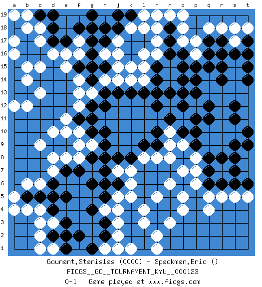 Last move : 0-1 2011 July 26 21:52:3 [Event "FICGS__GO__TOURNAMENT_KYU__000123"] [Site "FICGS"] [Date "2011.06.08"] [Round "1"] [Black "Gounant,Stanislas"] [White "Spackman,Eric"] [Result "0-1"] [Rating 1 "0000"] 1.e5 q4 2.p15 e15 3.k16 q10 4.k4 d10 5.h8 d7 6.c5 c6 7.e7 d8 8.e9 e8 9.f9 f8 10.d6 b6 11.d9 c9 12.h10 g9 13.g10 f10 14.g8 e10 15.h9 f9 16.f7 b4 17.b5 a5 18.d4 c4 19.d5 a4 20.g6 d3 21.e3 e2 22.d2 c3 23.f2 c2 24.e1 c1 25.g12 d1 26.e2 f12 27.f11 e11 28.g11 f13 29.g14 g13 30.h13 h14 31.h15 j14 32.g15 f14 33.k13 k14 34.h12 l14 35.m14 l15 36.m12 n14 37.m13 j15 38.j16 l16 39.l17 h16 40.g16 h17 41.g17 g18 42.h18 j17 43.j18 f16 44.k17 f17 45.f18 e18 46.g19 e19 47.m15 m16 48.n16 m17 49.j13 n15 50.n17 m18 51.n18 n19 52.l13 o19 53.o16 o18 54.o13 o17 55.o15 p16 56.n13 l18 57.q16 k18 58.k19 p17 59.q17 q18 60.o14 r18 61.r17 s17 62.s16 s18 63.q15 m19 64.j19 f19 65.g18 k15 66.t17 t18 67.t16 h16 68.f15 j17 69.e17 e16 70.d17 d16 71.d18 c17 72.d19 c18 73.c16 c15 74.b16 b15 75.b17 b18 76.a18 a16 77.a15 a17 78.p9 q9 79.p10 r11 80.q11 r12 81.q12 p8 82.q8 p7 83.r8 r9 84.s9 s10 85.s8 r10 86.t10 t11 87.t9 r13 88.q7 p6 89.r6 r5 90.s7 s5 91.t6 t5 92.s6 o4 93.r14 s13 94.t14 t13 95.s12 s14 96.t15 q14 97.r15 q13 98.p11 o9 99.o10 n9 100.o12 s15 101.r16 n10 102.n11 l4 103.m9 m8 104.l9 l8 105.m10 k5 106.k3 l3 107.l2 m2 108.k2 m1 109.l1 j7 110.k8 k7 111.j8 j5 112.h7 j4 113.j6 k6 114.h6 j2 115.h17 j16 116.q6 q5 117.c19 b19 118.h2 j3 119.h3 h4 120.g4 h1 121.g1 j1 122.h5 l19 123.b13 c13 124.a14 b14 125.a13 b12 126.m3 n3 127.m4 k1 128.n5 m5 129.n4 n6 130.o6 o5 131.o8 n8 132.p13 o7 133.p14 a12 134.s11 t12 135.s12 a19 136.s11 pass 0-1 Here are the names of the openings (joseki) played in the four corners : Corner d16 : e15 g12 Go-no-go (Wu~wu~) 5-5 Point. The 5-5 was experimented with briefly during the "New Fuseki" movement in Japan in the 1930s. The 5-5 point has not retained popularity because the 4-4 hoshi (star) point strikes a better balance between influence and territory. As one can see from the variations, though, the 5-5 is playable. Corner q16 : p15 l14 Go-no-go (Wu~wu~) 5-5 Point. The 5-5 was experimented with briefly during the "New Fuseki" movement in Japan in the 1930s. The 5-5 point has not retained popularity because the 4-4 hoshi (star) point strikes a better balance between influence and territory. As one can see from the variations, though, the 5-5 is playable. Corner q4 : q4 p9 Hoshi (Hwajeom, Seongjeom, Xingwei`) 4-4 Point. The star or hoshi (4-4) point, emphasizing influence at the potential expense of territory. Player White won this Go (weiqi, baduk) game. Follow this game move after move (download)There are players who don't accept exchange: they play many moves that perpetuate a previous state of the game. (Pierre Audouard) Philosophers use a language that is already deformed as though by shoes that are too tight. (Ludwig Wittgenstein)