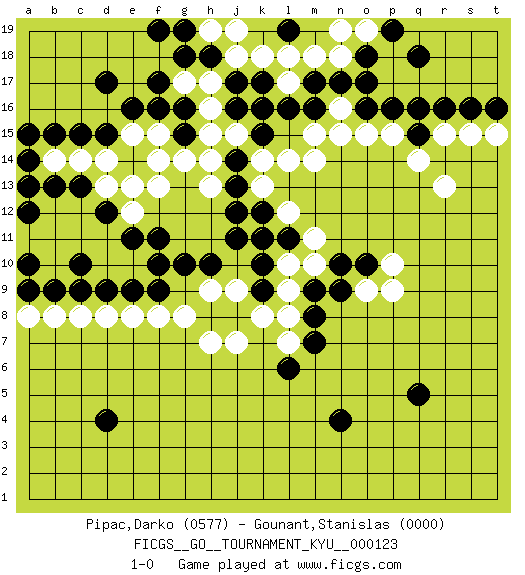 Last move : 1-0 2011 July 20 14:15:6 [Event "FICGS__GO__TOURNAMENT_KYU__000123"] [Site "FICGS"] [Date "2011.06.08"] [Round "1"] [Black "Pipac,Darko"] [White "Gounant,Stanislas"] [Result "1-0"] [Rating 1 "0577"] [Rating 2 "0000"] 1.d4 p15 2.q5 d10 3.j11 e15 4.q15 q14 5.q16 r15 6.p16 o15 7.o16 n16 8.o17 r13 9.n17 m15 10.f17 g17 11.f16 f15 12.g16 h17 13.e16 h15 14.d15 d14 15.c15 d13 16.j16 h16 17.g15 g14 18.g18 h14 19.j17 j18 20.h18 k18 21.k17 l17 22.k15 l18 23.j14 f14 24.l16 m18 25.m16 n15 26.m17 n18 27.o18 o19 28.p19 n19 29.q18 j15 30.k16 k14 31.j13 k13 32.k12 l14 33.f19 h19 34.g19 j19 35.l19 m14 36.r16 s15 37.s16 t15 38.t16 h13 39.j12 e13 40.n4 c14 41.b15 b14 42.a14 a13 43.a15 f13 44.b13 b12 45.a12 a11 46.a13 b11 47.c13 c12 48.d17 p10 49.o10 o9 50.n10 m10 51.n9 p9 52.m9 m11 53.l11 l10 54.k10 l12 55.k11 l9 56.m8 l8 57.m7 l7 58.l6 j9 59.k9 k8 60.j8 j7 61.h8 h9 62.h10 g8 63.g10 h7 64.f9 f8 65.e9 d8 66.d9 e8 67.c9 c8 68.b9 b8 69.a10 b10 70.a9 a8 71.c10 d11 72.e11 e10 73.f10 e12 74.f11 c11 75.d12 1-0 Here are the names of the openings (joseki) played in the four corners : Corner d16 : j11 e15 This joseki is unknown. A weak or weird move has probably been played in this corner. Corner q16 : p15 q15 Go-no-go (Wu~wu~) 5-5 Point. The 5-5 was experimented with briefly during the "New Fuseki" movement in Japan in the 1930s. The 5-5 point has not retained popularity because the 4-4 hoshi (star) point strikes a better balance between influence and territory. As one can see from the variations, though, the 5-5 is playable. Corner d4 : d4 j9 Hoshi (Hwajeom, Seongjeom, Xingwei`) 4-4 Point. The star or hoshi (4-4) point, emphasizing influence at the potential expense of territory. Player Black won this Go (weiqi, baduk) game. Follow this game move after move (download)There is death in the hane. (Anonymous) Rules and bones are meant to be broken. (Anonymous)