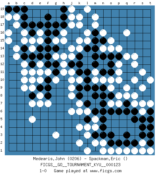 Last move : 1-0 2011 November 8 0:37:21 [Event "FICGS__GO__TOURNAMENT_KYU__000123"] [Site "FICGS"] [Date "2011.06.08"] [Round "1"] [Black "Medearis,John"] [White "Spackman,Eric"] [Result "1-0"] [Rating 1 "0206"] 1.q3 q16 2.d16 d5 3.r5 j17 4.f17 k4 5.q10 d11 6.l17 l16 7.k16 k17 8.m16 l15 9.l14 k15 10.j16 h16 11.j15 j14 12.h17 h15 13.g16 g15 14.f15 m17 15.l18 m18 16.m15 l19 17.m14 k18 18.h19 j18 19.h18 f14 20.g17 e15 21.f16 e16 22.e17 d15 23.c17 c15 24.b15 c16 25.d17 b14 26.b16 b17 27.a17 b18 28.c18 a18 29.b19 a16 30.c19 a15 31.a19 n16 32.l11 o14 33.p13 p14 34.o13 n14 35.n13 k14 36.m13 q13 37.q12 r13 38.k13 j13 39.j12 h12 40.k11 j11 41.k12 j9 42.k8 j8 43.k9 k10 44.l10 j10 45.l9 k7 46.n4 l6 47.m6 m5 48.l7 j6 49.m8 m4 50.l5 k6 51.m3 l3 52.l2 k2 53.n5 l4 54.n6 m2 55.n3 n2 56.o2 o1 57.m1 l1 58.o3 p1 59.p2 q1 60.r2 r1 61.s1 s2 62.q2 t1 63.s3 t3 64.s4 t4 65.t5 r12 66.r11 s11 67.t2 t3 68.t4 n1 69.t2 s1 70.t3 r10 71.q11 q9 72.p9 q8 73.q7 r7 74.q6 p8 75.o8 p7 76.p6 o7 77.n7 o9 78.n8 p10 79.o6 p12 80.o11 p11 81.o12 n10 82.n11 m10 83.m9 m11 84.m12 o10 85.n15 o15 86.s8 r8 87.s7 s9 88.t9 t10 89.t8 s6 90.r6 t7 91.t6 j19 92.f18 g3 93.d8 e8 94.e9 d9 95.f8 e7 96.d10 c9 97.e11 d7 98.f10 f7 99.d12 c11 100.e13 c10 101.e14 e10 102.f9 d10 103.d13 f11 104.f13 e12 105.g14 g13 106.g12 h13 107.f12 e11 108.g11 g10 109.pass h11 110.s5 s7 111.n9 c12 112.c13 b13 113.c14 d14 114.f14 1-0 Here are the names of the openings (joseki) played in the four corners : Corner d16 : d16 j17 Hoshi (Hwajeom, Seongjeom, Xingwei`) 4-4 Point. The star or hoshi (4-4) point, emphasizing influence at the potential expense of territory. Corner q16 : q16 l17 Hoshi (Hwajeom, Seongjeom, Xingwei`) 4-4 Point. The star or hoshi (4-4) point, emphasizing influence at the potential expense of territory. Player Black won this Go (weiqi, baduk) game. Follow this game move after move (download)With less than 15 stones in danger, tenuki. (Anonymous) What doesn't kill us makes us stronger. (Friedrich Nietzsche)