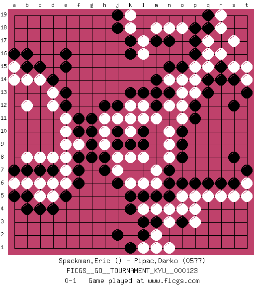 Last move : 0-1 2011 November 7 12:38:9 [Event "FICGS__GO__TOURNAMENT_KYU__000123"] [Site "FICGS"] [Date "2011.06.08"] [Round "1"] [Black "Spackman,Eric"] [White "Pipac,Darko"] [Result "0-1"] [Rating 2 "0577"] 1.d4 q16 2.e16 p3 3.l3 c5 4.c4 c6 5.b5 b6 6.a5 a6 7.b4 d5 8.e5 e6 9.f6 e7 10.f7 e8 11.f8 e9 12.f10 f9 13.g9 e10 14.f11 e11 15.e12 d12 16.e13 d13 17.d14 c14 18.d7 d8 19.c7 c8 20.b7 b8 21.a7 d6 22.c15 a15 23.b15 b14 24.b16 b12 25.a16 a14 26.e15 k10 27.o3 p4 28.p16 q15 29.q14 p15 30.p17 q17 31.q18 p14 32.q13 r18 33.q19 r19 34.p18 s17 35.r14 s15 36.r15 r16 37.s14 t14 38.t13 t15 39.s12 p13 40.p12 o13 41.o15 n14 42.n15 o11 43.p11 o12 44.o10 n10 45.o9 n9 46.o8 n8 47.n7 p5 48.p6 o5 49.o6 m7 50.n6 m6 51.n5 q5 52.q6 r5 53.r6 s5 54.s6 t6 55.t7 t5 56.s8 n4 57.m5 m4 58.l5 l4 59.k4 o4 60.m14 m13 61.l13 l12 62.k13 k12 63.j12 j11 64.h12 n3 65.m3 m2 66.l2 n1 67.j10 h11 68.g11 h10 69.j9 h9 70.h8 j8 71.k9 k8 72.l9 l8 73.h7 j7 74.j6 k6 75.k5 l6 76.g10 l1 77.k1 m1 78.j2 k11 79.m12 m11 80.n13 o14 81.l10 l11 82.g8 n12 83.m13 l16 84.k16 l17 85.k17 k18 86.j18 k19 87.j19 m18 88.m17 n18 89.n17 o18 0-1 Here are the names of the openings (joseki) played in the four corners : Corner q4 : p3 l3 Mokuhazushi (Waemok, Wai`mu`) 5-3 Point. The mokuhazushi (5-3) point was popular in the Edo period in Japan (1600 - 1867). It emphasizes influence; territorially, it is inferior to the 3-4 point. Corner d4 : d4 c5 Hoshi (Hwajeom, Seongjeom, Xingwei`) 4-4 Point. The star or hoshi (4-4) point, emphasizing influence at the potential expense of territory. Corner q16 : q16 p16 Hoshi (Hwajeom, Seongjeom, Xingwei`) 4-4 Point. The star or hoshi (4-4) point, emphasizing influence at the potential expense of territory. Player White won this Go (weiqi, baduk) game. Follow this game move after move (download)If you don't know ladders, don't play go. (Anonymous) It's not the will to win, but the will to prepare to win that makes the difference. (Bear Bryant)