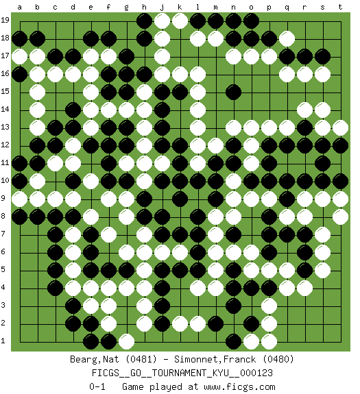 Last move : 0-1 2011 September 16 6:27:21 [Event "FICGS__GO__TOURNAMENT_KYU__000123"] [Site "FICGS"] [Date "2011.06.08"] [Round "1"] [Black "Bearg,Nat"] [White "Simonnet,Franck"] [Result "0-1"] [Rating 1 "0481"] [Rating 2 "0480"] 1.c7 q4 2.r13 q16 3.g17 d16 4.n3 p3 5.k10 n17 6.r7 s5 7.g3 d4 8.c13 c9 9.n15 e14 10.c17 c16 11.d17 e17 12.e18 f17 13.f18 e15 14.f16 e16 15.f15 d7 16.c6 d6 17.c5 l16 18.f13 e13 19.e12 d12 20.c12 d11 21.d13 f14 22.f12 g14 23.g15 h15 24.g16 h12 25.g13 h13 26.j14 h14 27.j15 j16 28.h16 j17 29.h18 l13 30.j13 b17 31.b18 a17 32.a18 b15 33.d10 c11 34.b12 e10 35.f11 d9 36.b11 b10 37.a10 a9 38.a11 b14 39.a8 b9 40.b8 r9 41.d8 e8 42.c8 h10 43.h11 g11 44.f10 f9 45.g10 g9 46.g12 j11 47.e7 f7 48.e6 d5 49.c4 r14 50.r17 r16 51.q17 p17 52.s17 s16 53.p18 o17 54.o18 p9 55.q9 q8 56.q10 r8 57.q7 q13 58.r12 r11 59.r10 q11 60.q12 p13 61.p11 s13 62.s11 o11 63.p8 s7 64.s8 s9 65.r6 s6 66.r5 r4 67.p4 q5 68.p7 o9 69.o10 n10 70.p10 n8 71.n11 o12 72.m10 n9 73.m9 l11 74.n7 m8 75.l8 l9 76.l10 m7 77.l7 m6 78.l5 n6 79.p6 p5 80.o4 o5 81.n5 m5 82.n4 o6 83.s10 t8 84.s12 t13 85.t12 s14 86.t10 t9 87.n12 n13 88.m11 m12 89.p12 o13 90.k11 l12 91.j12 g11 92.j10 h11 93.k15 l15 94.k12 l14 95.k9 g4 96.e5 e4 97.f5 f4 98.g5 h4 99.j4 h3 100.g2 h2 101.d3 e3 102.e2 f2 103.j3 h5 104.h6 h7 105.g7 j6 106.j5 k6 107.l6 l4 108.k5 m4 109.o2 p2 110.m2 k2 111.j7 g6 112.k7 h6 113.h8 g8 114.h9 k16 115.d14 b13 116.a16 b16 117.j8 j18 118.h19 j19 119.n18 m18 120.m19 l18 121.l19 n19 122.o19 k19 123.n19 q18 124.f1 f3 125.d2 g1 126.e1 o1 127.n1 p1 128.j2 l2 0-1 Here are the names of the openings (joseki) played in the four corners : Corner q16 : r13 q16 This joseki is unknown. A weak or weird move has probably been played in this corner. Corner d16 : g17 d16 This joseki is unknown. A weak or weird move has probably been played in this corner. Corner q4 : q4 n3 Hoshi (Hwajeom, Seongjeom, Xingwei`) 4-4 Point. The star or hoshi (4-4) point, emphasizing influence at the potential expense of territory. Niken Kakari (Dukan Keolch'im, E`r Gua`jiao~, 2-Space Low Approach). White typically answers by 7-3 or 3-5 (which is not joseki). Player White won this Go (weiqi, baduk) game. Follow this game move after move (download)When your opponent has two weak groups, attack them both at once. (Anonymous) A mistake is only a mistake if you let it happen twice. Otherwise it is a learning experience. (Daniel Parmet)